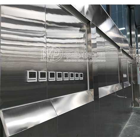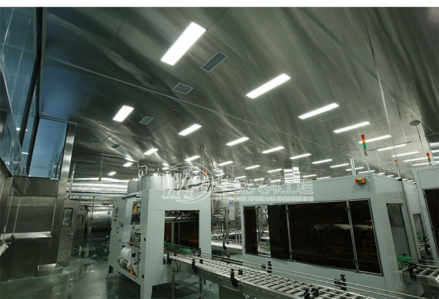 其中,車間墻面均采用雙面不銹鋼中空玻鎂板,A1級防火板材。便于車間沖洗,防潮,防水,耐腐蝕。吊頂也是不銹鋼板材,整個車間猶如“鐵桶”一般。