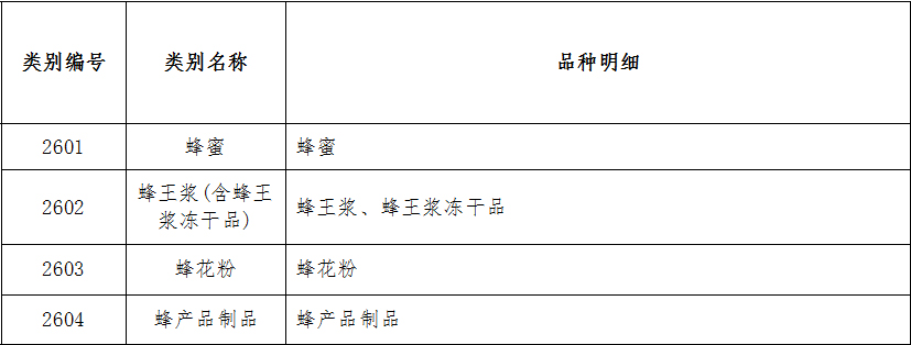 蜂產(chǎn)品類別編號及類別名稱:2601蜂蜜;2602蜂王漿(含蜂王漿凍干品);2603蜂花粉;2604蜂產(chǎn)品制品