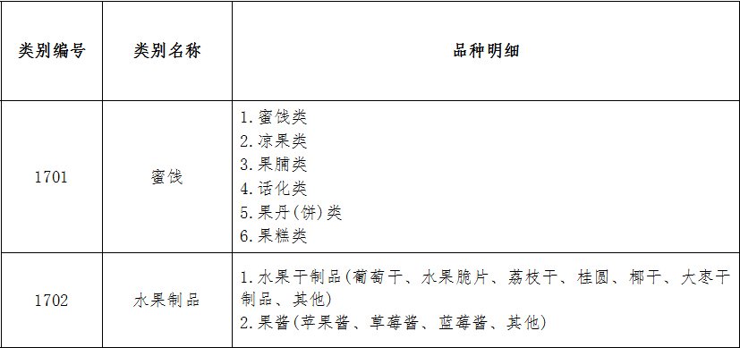 水果制品類別編號及類別名稱:1701蜜餞;1702水果制品