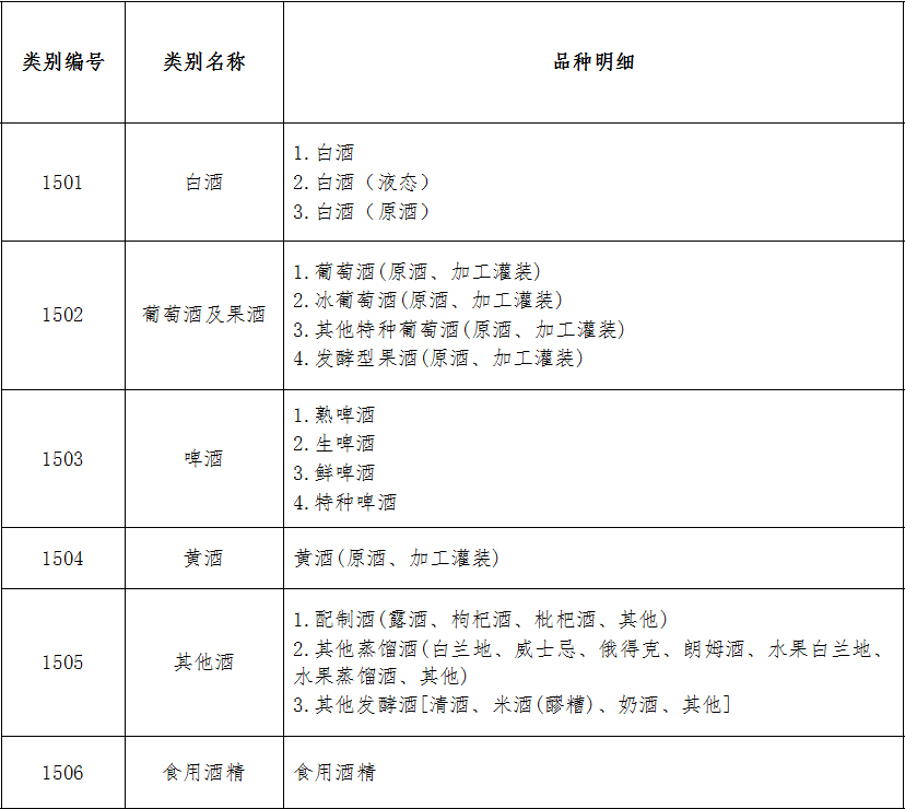 酒類產(chǎn)品類別編號及類別名稱:1501白酒;1502葡萄酒及果酒;1503啤酒;1504黃酒;1505其他酒;1506食用酒精