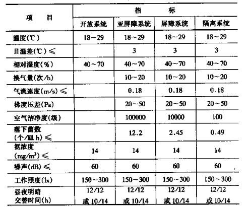 噪聲可使動物受到刺激而引起緊張,導致不安和騷動。即使短暫的噪聲也能在動物的行為和生理上引起反應。豚鼠特別怕噪聲。噪聲可引起孕鼠流產和母鼠放棄育仔。動物能聽到的音域頻率較寬。動物實驗環境的噪聲宜小于60dB。在進行藥廠設計時,可參照我國《實驗動物環境及設施》(GB/T1492594)對實驗動物環境的各項指標要求,見圖1。