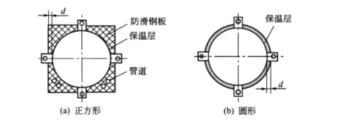 4、釜式反應器、塔器、蒸發器等可直接懸掛在樓面或操作臺上,此時應在樓面或操作臺的相應位置預留出設備孔。設備孔可以做成正方形,安裝時可將設備直接由設備孔中吊至一定高度后再旋轉45°放下,使支座支承在樓面或操作臺上,如圖2(a)所示穿越樓面或操作臺的管道可經方孔角通過,剩余處可輔上防滑鋼板。設備孔也可以做成圓形,安裝時設備只能由上往下放入設備孔中,如圖2(b)所示。圖2中,空隙d的尺寸一般應比支座下部突出物(含保溫層)的最大尺寸大0.1~0.3m。