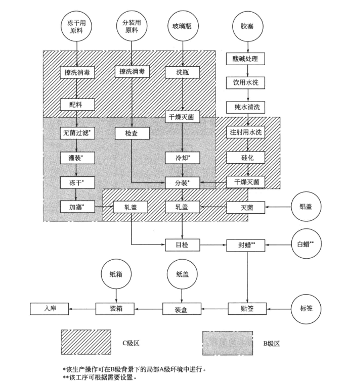 粉針劑的生產工藝流程及對制藥凈化車間的潔凈等級要求如圖1所示,其中擦洗、消毒、稱量、配料、洗瓶、軋蓋等工序應在C級的潔凈環境中進行;而無菌過濾、灌裝、凍干、分裝等工序可在B級的潔凈環境和B級背景下的局部A級的潔凈環境中進行。