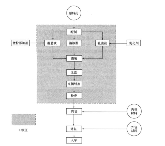 氣霧劑的主要生產(chǎn)工序包括稱量、配制、灌裝、壓蓋、充拋射劑、檢查、內(nèi)包裝、外包裝和入庫等,其生產(chǎn)工藝流程及對環(huán)境的潔凈等級要求如圖1所示,其中稱量、配制、灌裝、壓蓋、充拋射劑、檢查等工序應在不低于C級的潔凈環(huán)境中進行。