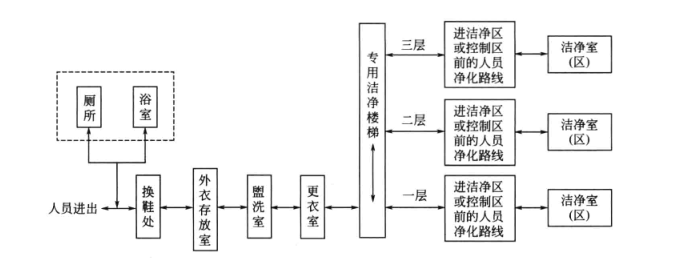 對(duì)于多層潔凈廠房,衛(wèi)生通道與潔凈室常采用分層布置。通常是將換鞋處、外衣存放室、淋浴室、換內(nèi)衣室布置在底層,然后通過(guò)潔凈樓梯至有關(guān)各層,依次經(jīng)過(guò)各層的二次更衣室(即穿無(wú)菌衣、鞋和手消毒室)、風(fēng)淋室,再進(jìn)入潔凈區(qū),如圖1所示。
