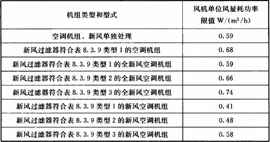 注:新風處理增設預熱盤管,單位風量耗功率限值可附加0.049W/(m3/h);增設新風表冷器,限值附加0.068W/(m3/h)。