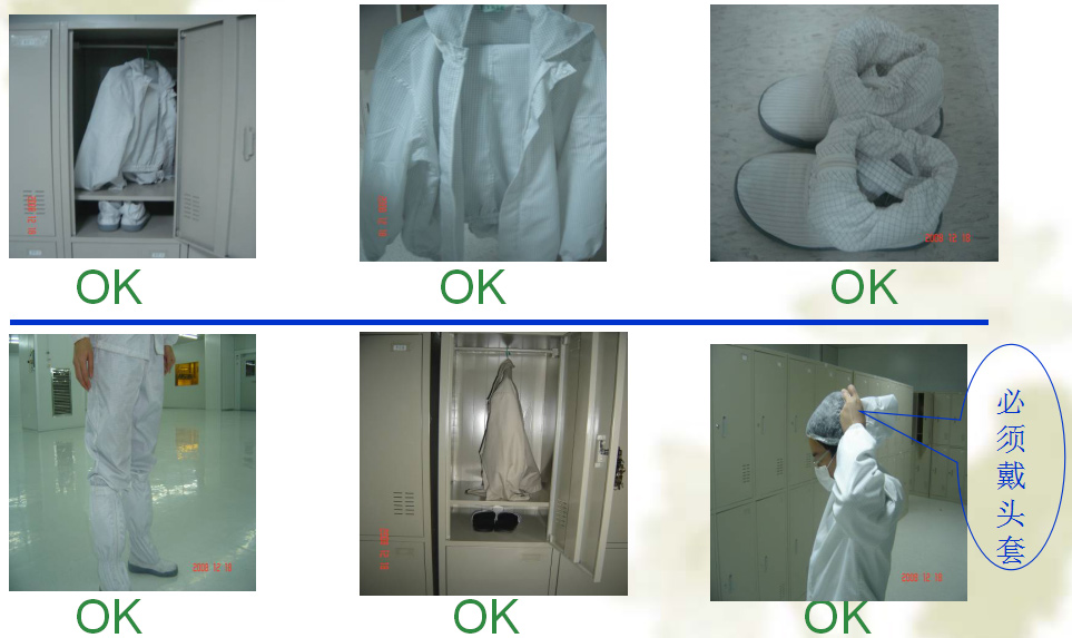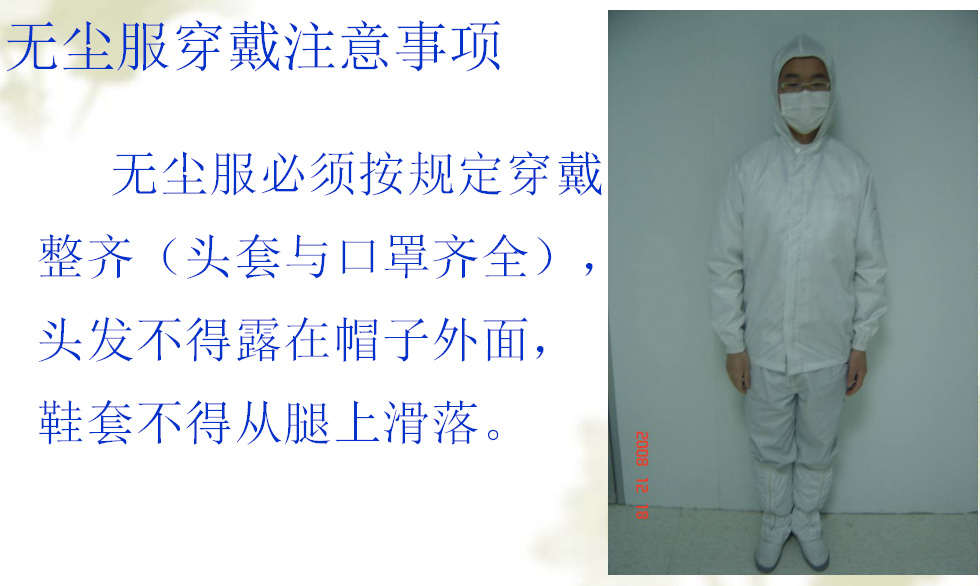 2、作業(yè)人員平時應注意個人衛(wèi)生,至少每周洗一 至兩次頭發(fā),避免產生頭皮屑。男士每天要剃須;經(jīng)常洗手,修剪指甲;女士在進入無塵室前必須卸妝。
