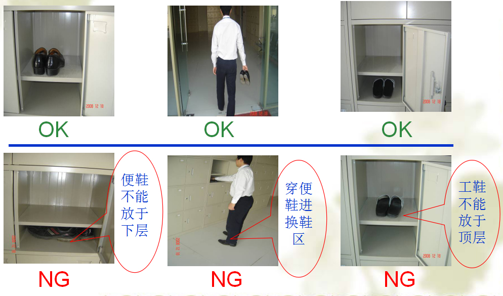 3、鞋柜中便鞋放于上層,工鞋放于下層,兩者不能混放;