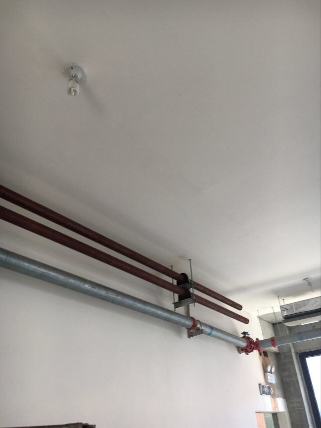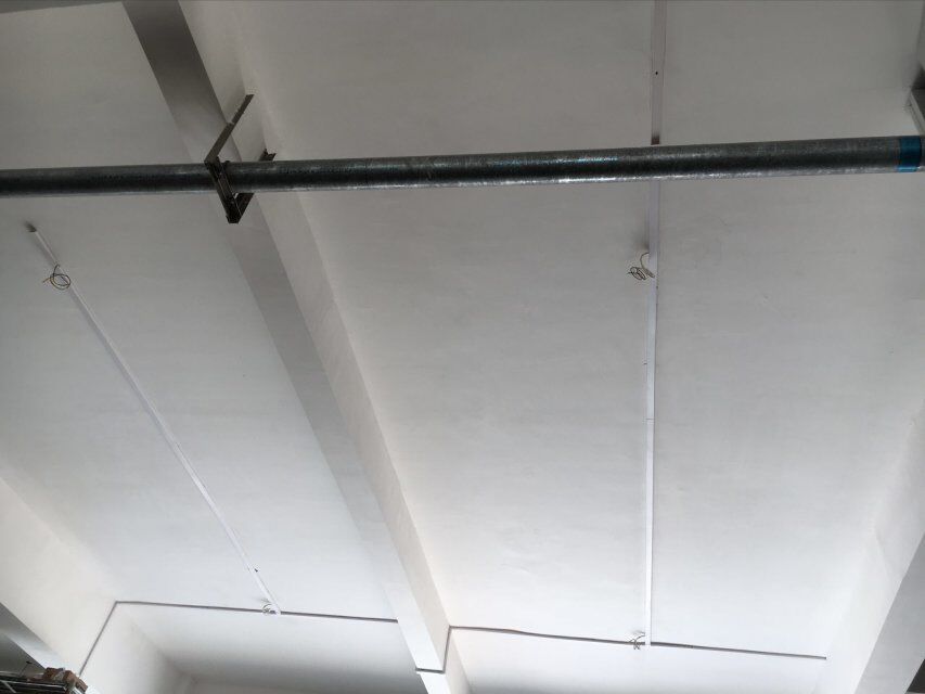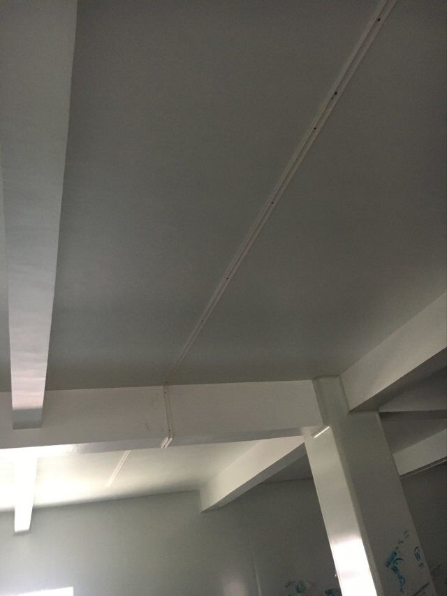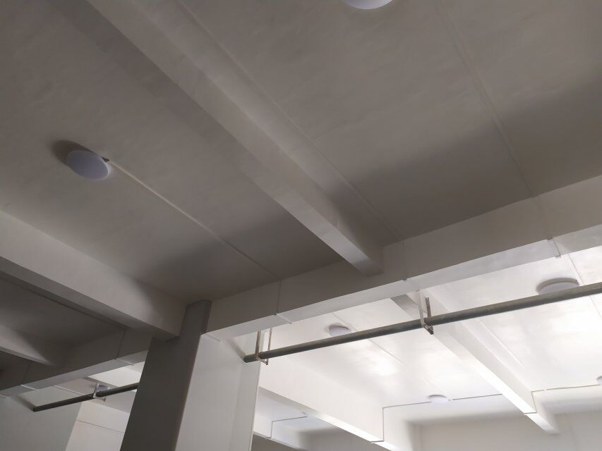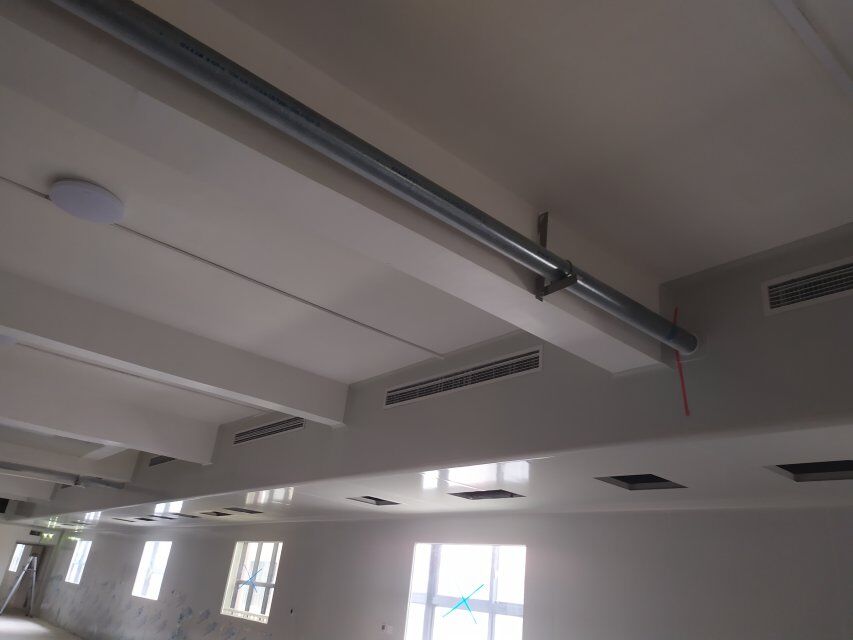 四川美料美味食品科技有限公司廠房施工現(xiàn)場(chǎng),紫外燈安裝完成,二層地面施工