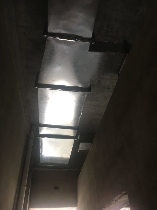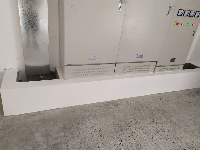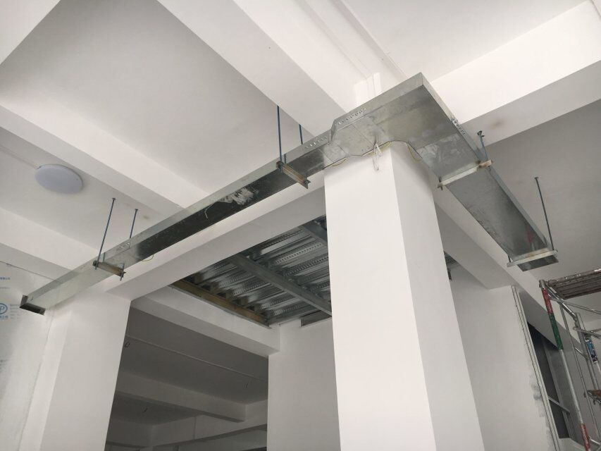 四川美料美味食品科技有限公司廠房裝修現(xiàn)場(chǎng):排風(fēng)口安裝,地坪施工,地面貼磚