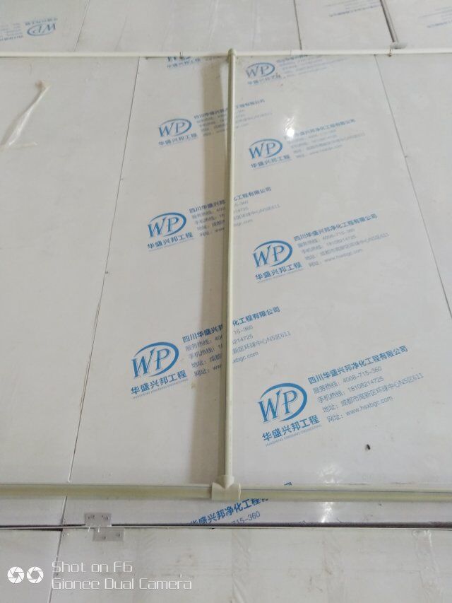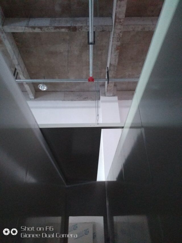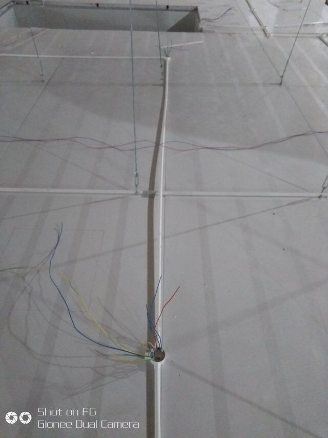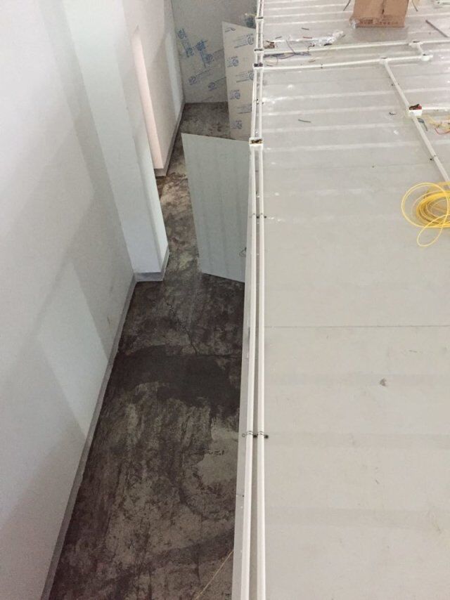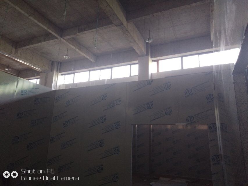 四川憨憨豆匠食品有限公司二期廠房裝修現(xiàn)場:掉頂板,開關(guān)插座開孔