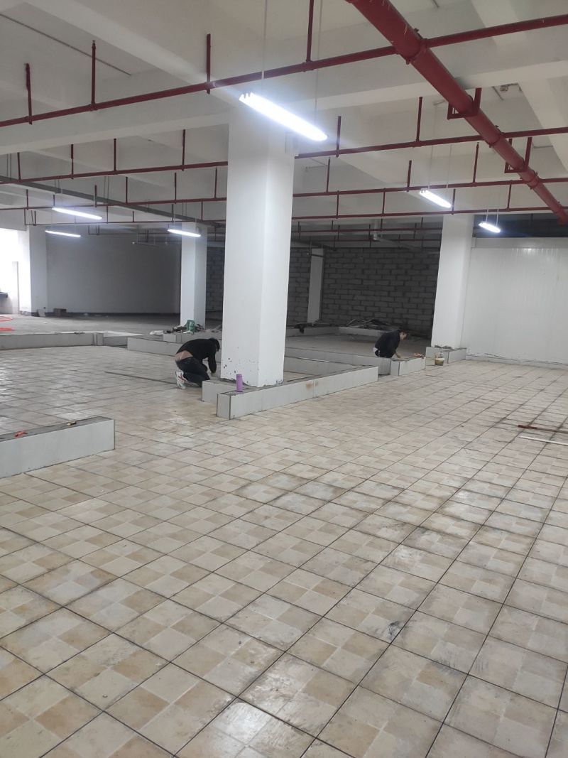 地磚鋪設(shè)完成一半,清洗間墻磚開始施工,車間衛(wèi)生打掃完成