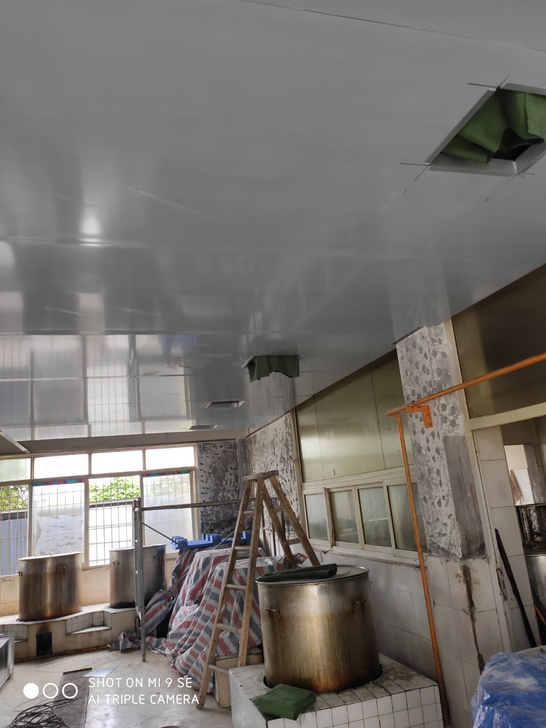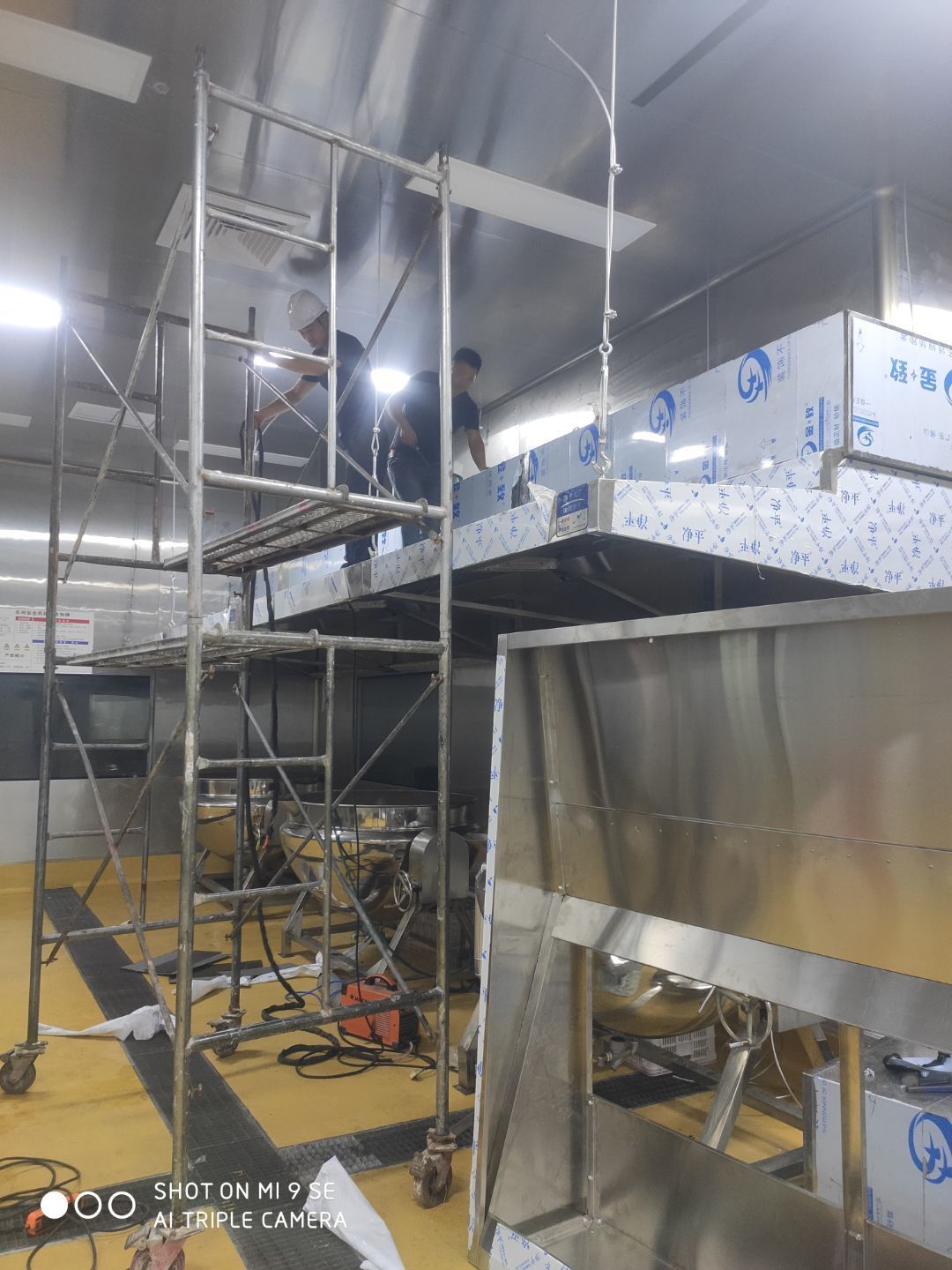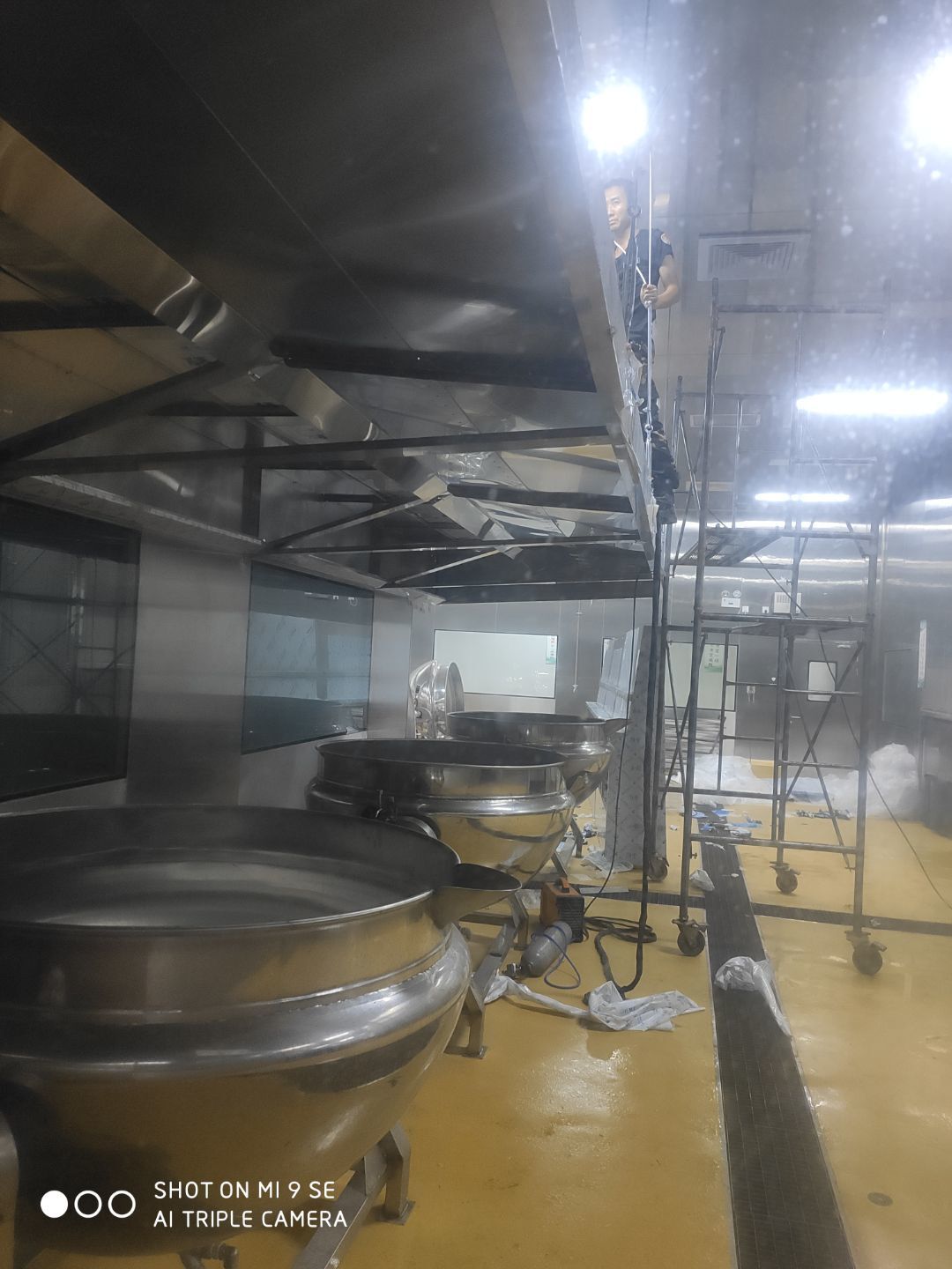春之源廠房裝修現場:1.煙罩安裝完成50% 2.風機風柜吊裝完成 3.地坪修補完成
