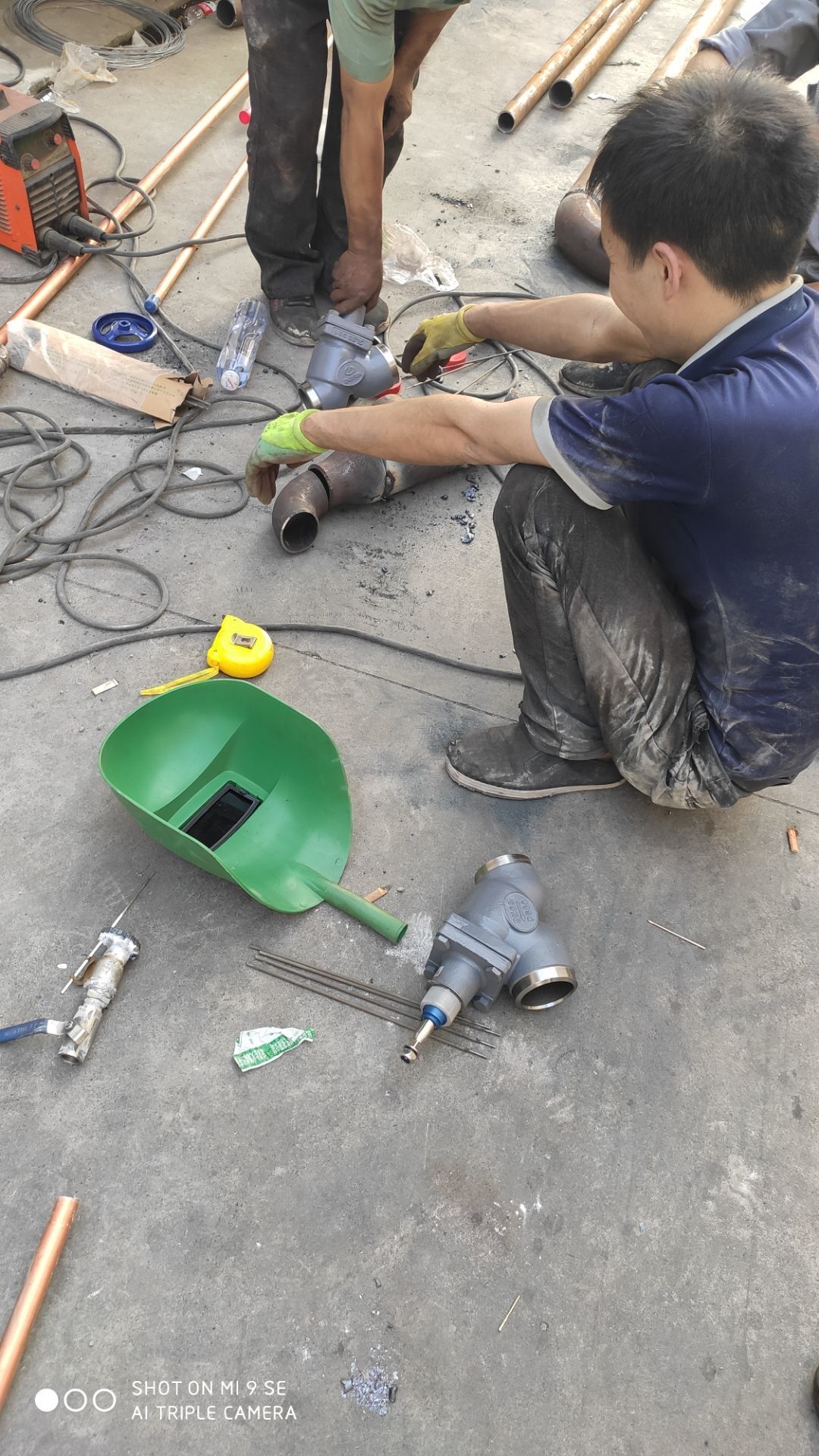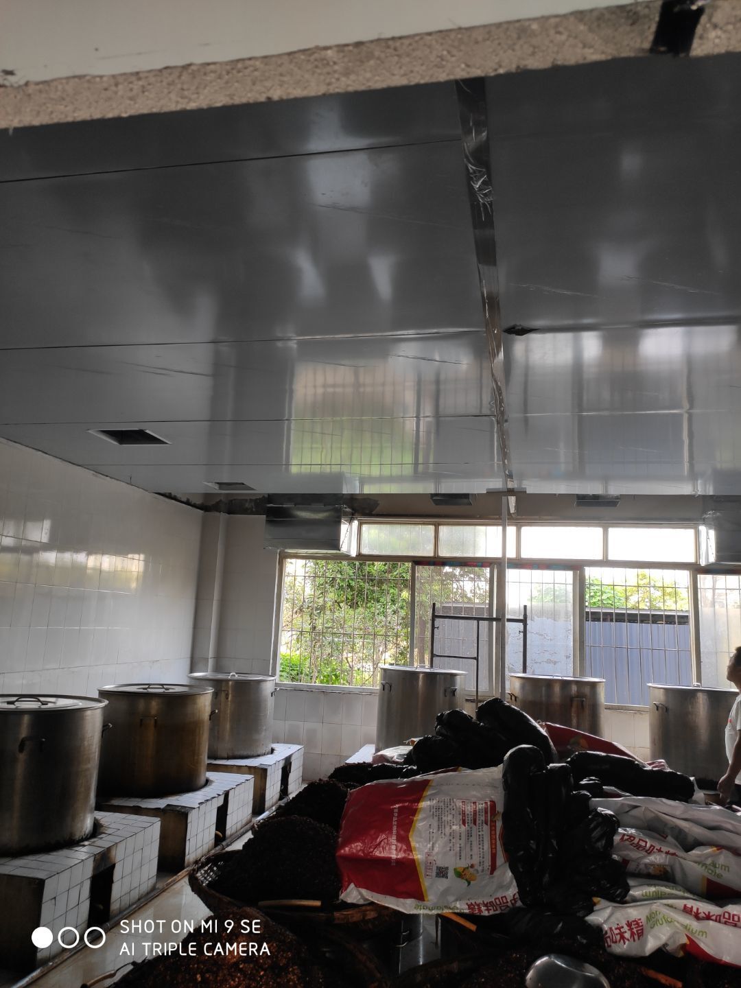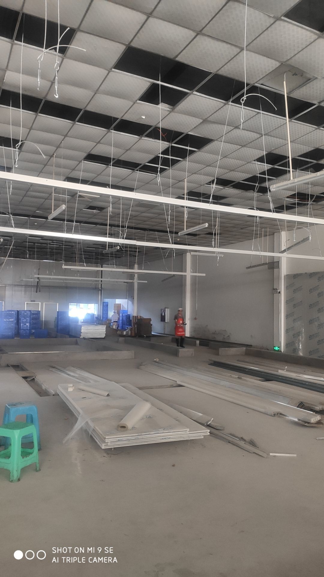 春之源廠房裝修現場:1.煙罩安裝完成50% 2.風機風柜吊裝完成 3.地坪修補完成