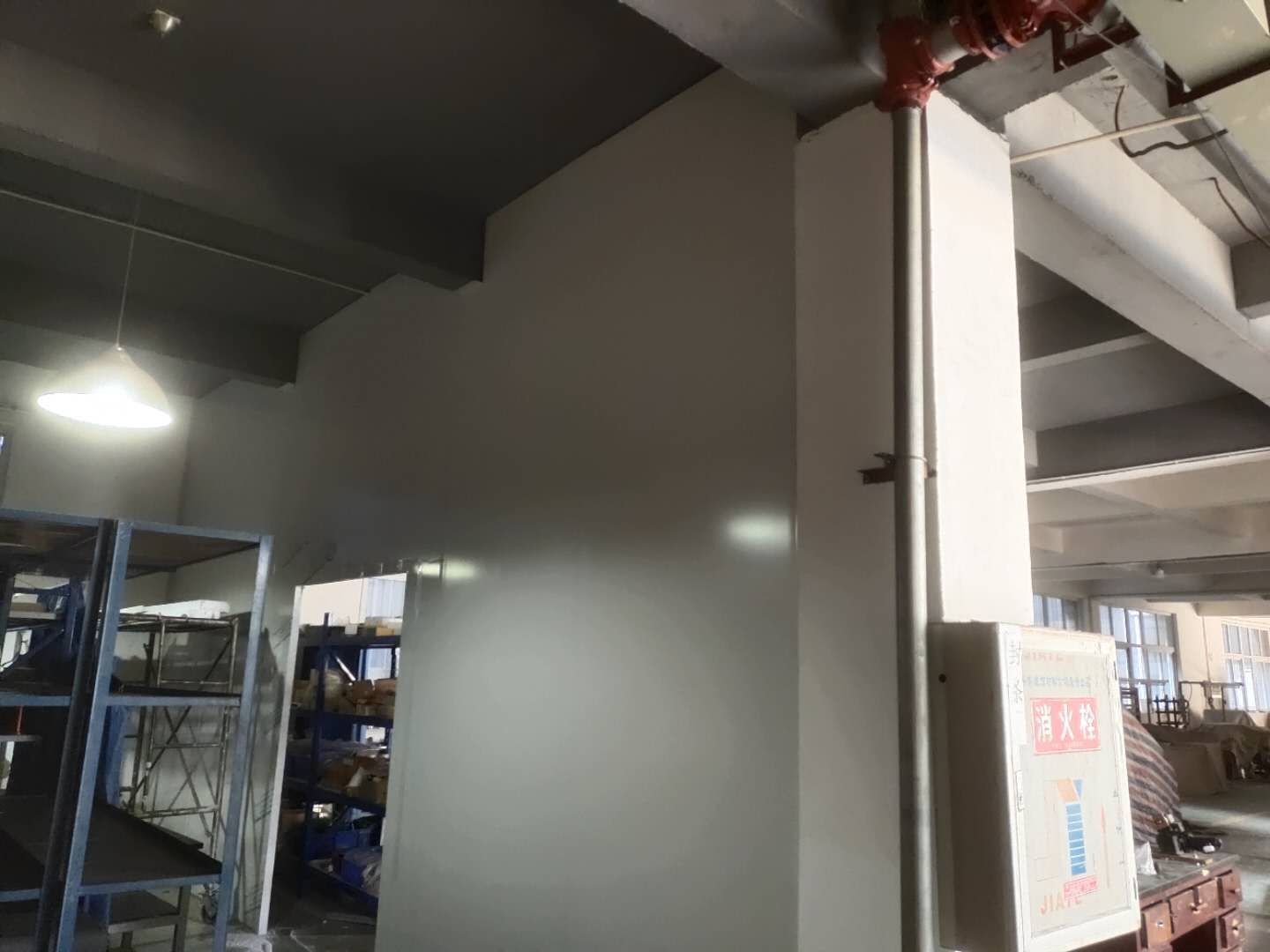 1.彩鋼材料到場卸貨搬運至車間內部。2.放線完成30%,地槽安裝完成30%,墻板安裝完成15%。3.插座移位置改線完成。4.墻面抗裂砂漿修補完成。