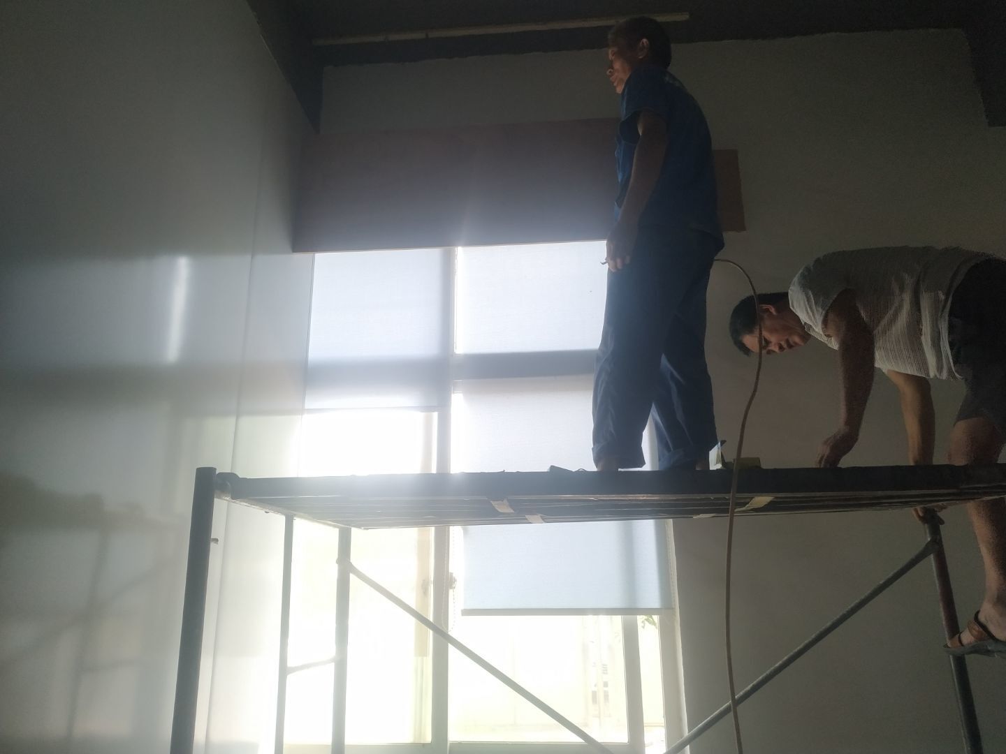 1.增項墻體拆除完成,窗簾盒安裝完成。2.彩鋼立板安裝,門框料預制完成,門框安裝完成50%,撕膜完成,打膠完成25%,塑料底座安裝完成40%,圓弧安裝完成20%。