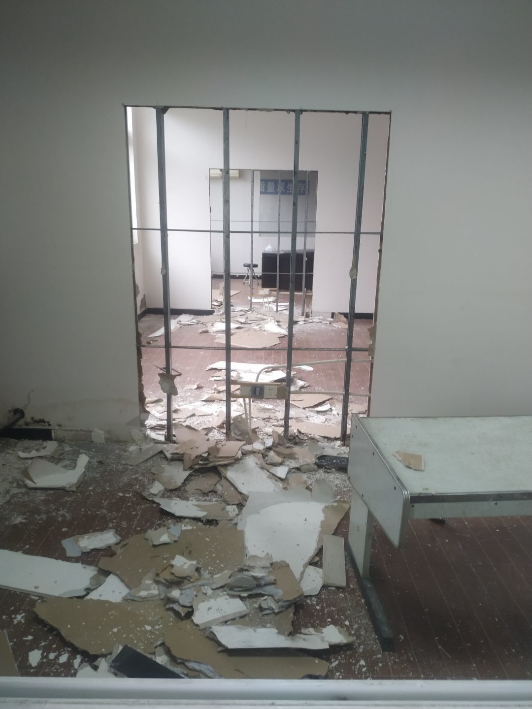 1.門安裝完成,擋鼠板安裝完成,彩鋼收尾結束。2.照明燈換氣扇安裝完成95%,紫外線燈安裝完成,插座安裝完成。