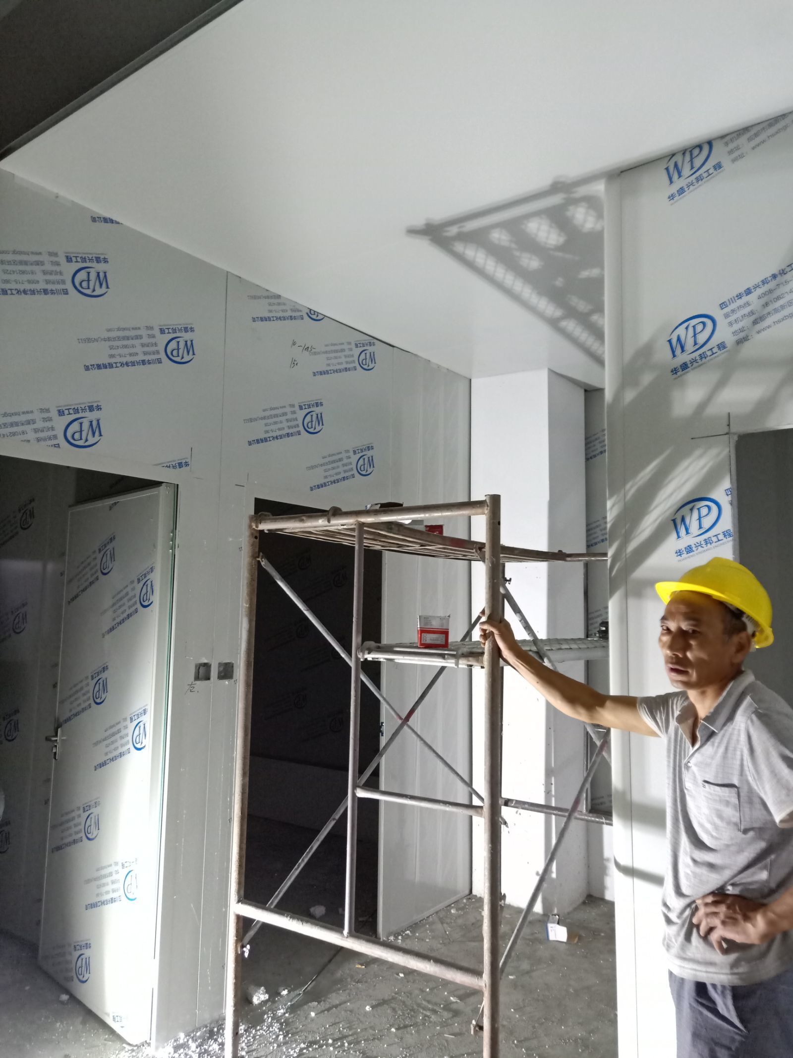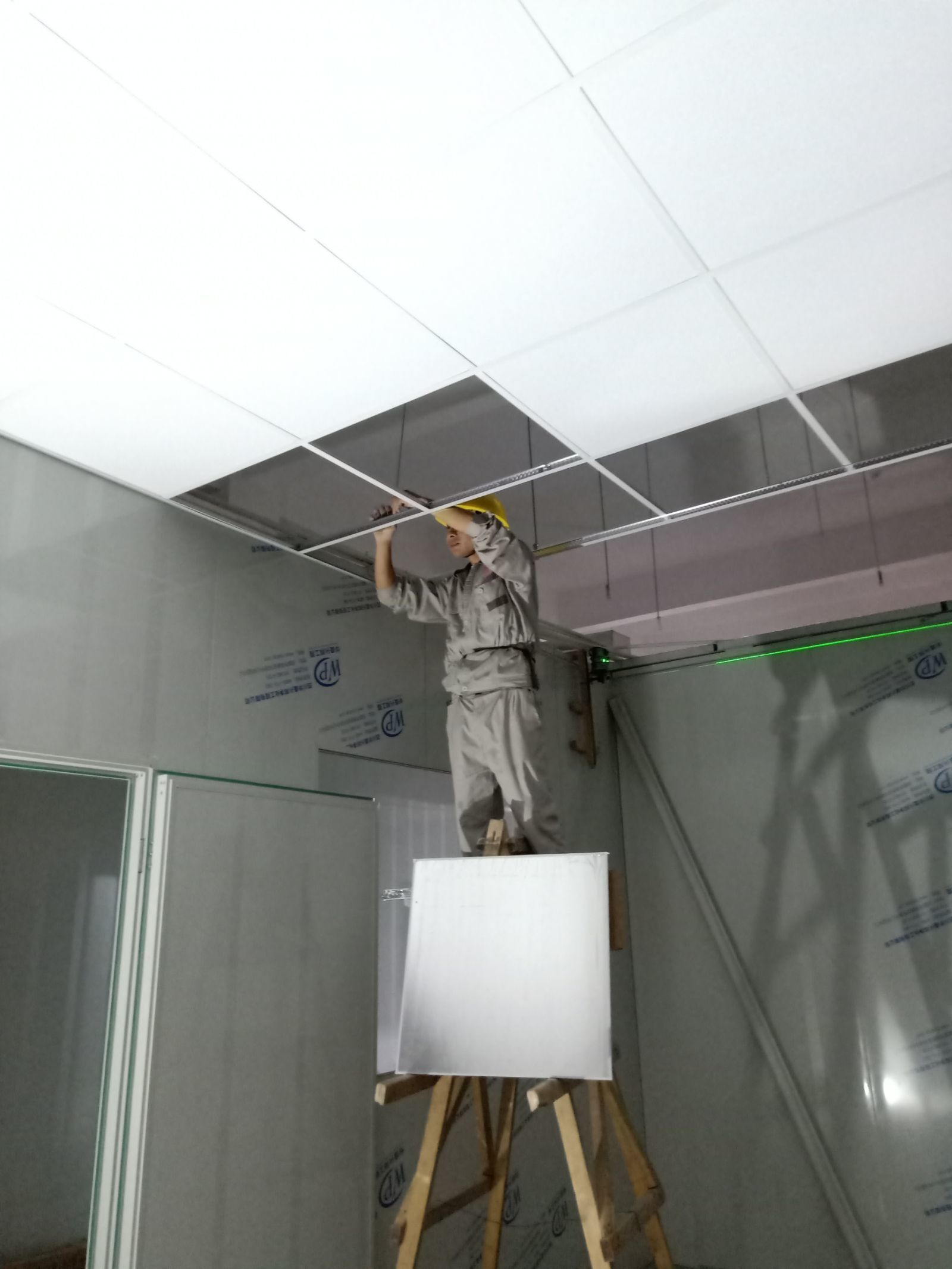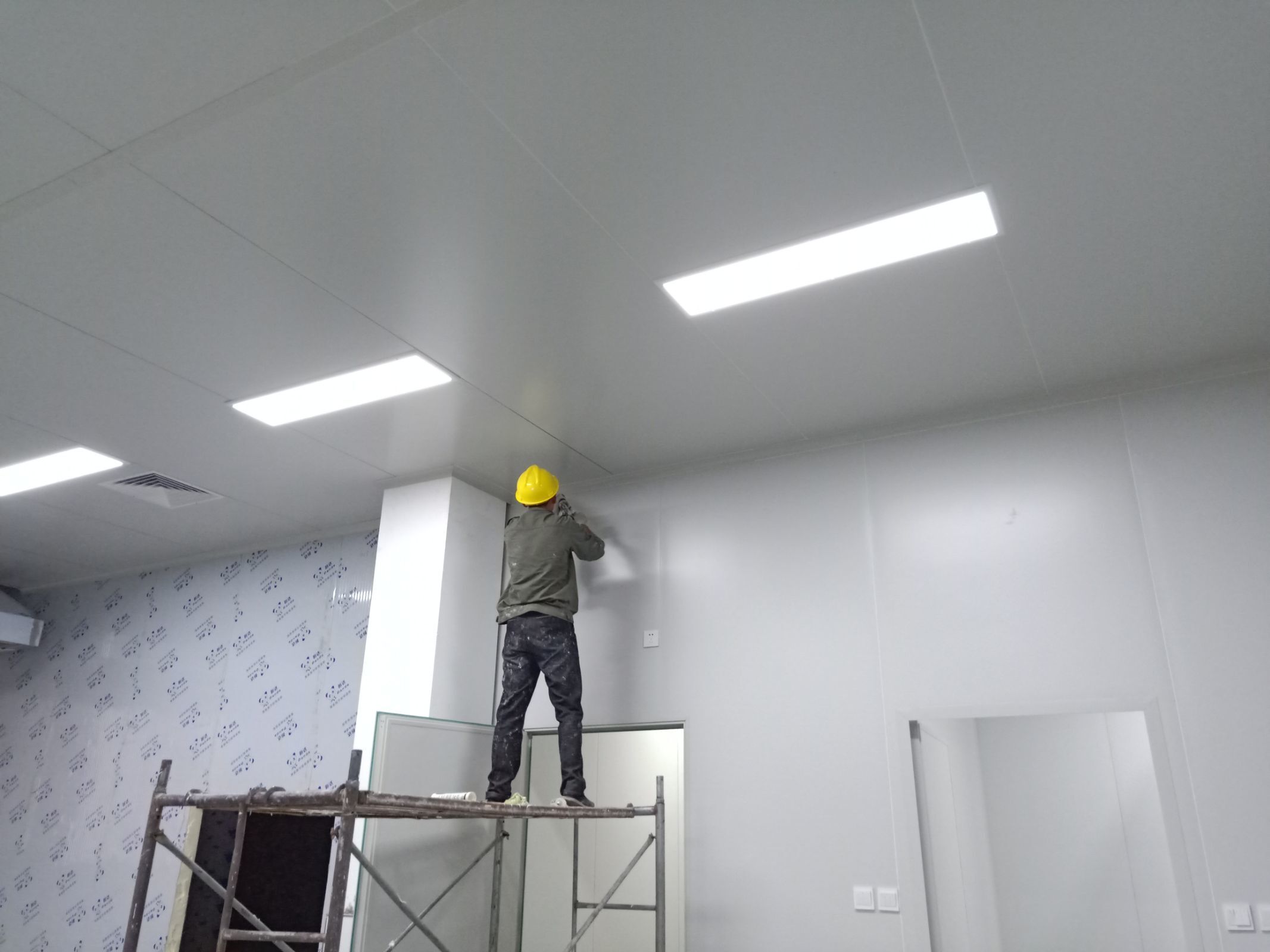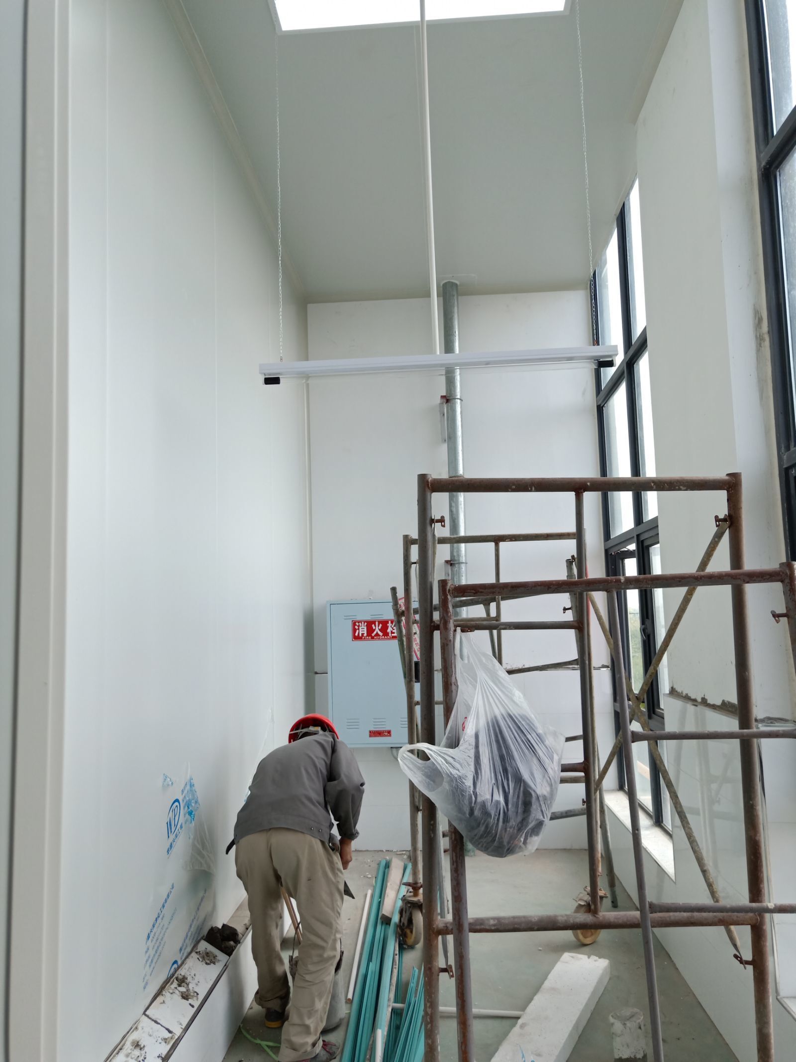 1.三防板吊頂材料到場。 2.彩鋼板吊頂材料到場,吊上樓。 3.彩鋼板吊頂完成百分之五。 4.線盒開孔完成百分之六十。 5.墻磚鋪貼完成百分之八五。 6.污水池砌磚完成百分之六十。