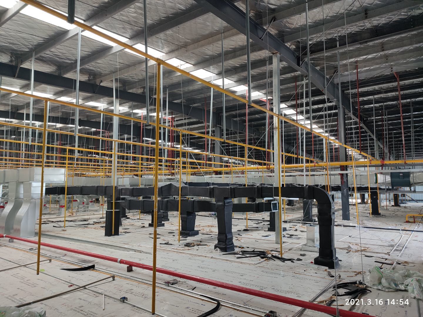 1、二次吊掛鋼結(jié)構(gòu)立柱及連接橫梁完成,鋼網(wǎng)架完成約70%; 2、凈化風(fēng)管制作完成,主管半成品加工