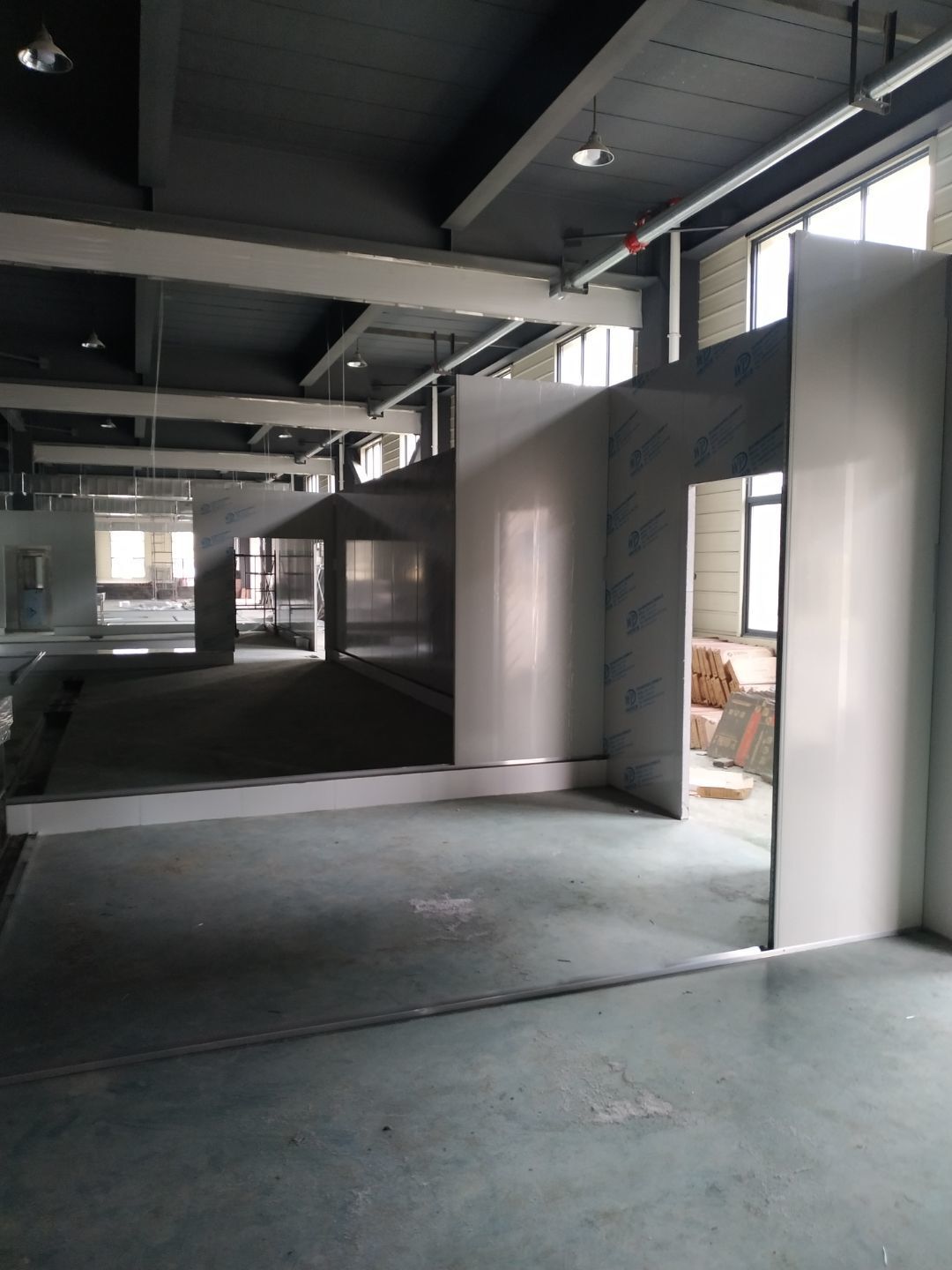 防火隔斷墻上門洞開孔完成,彩鋼墻窗戶開孔完成,門料預制,撕膜打膠,彩鋼板材料到場。