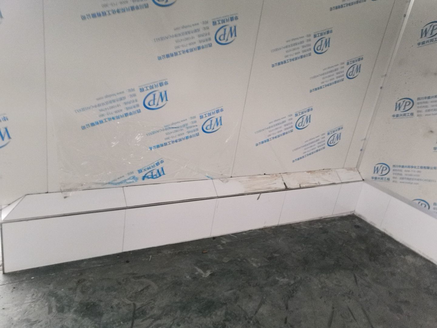 1.車間立墻板,掛T鋁;2.擋水墻貼斜坡,勾縫,做腳踏池