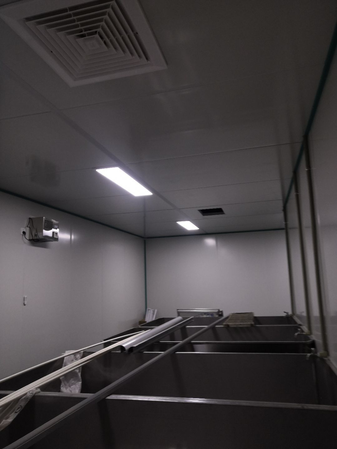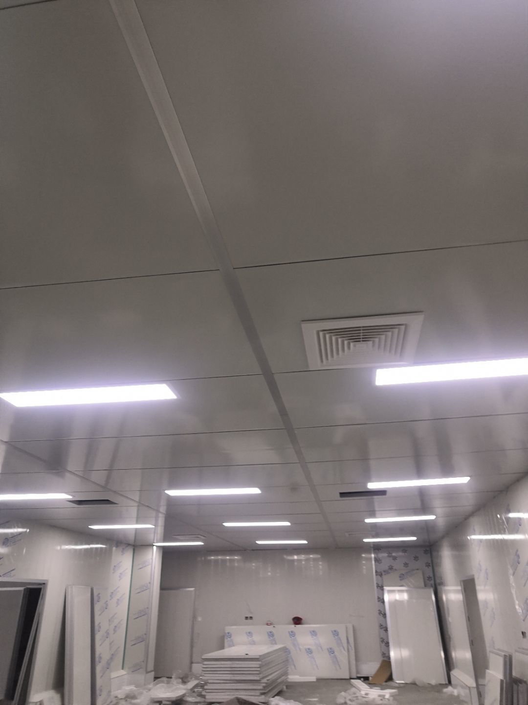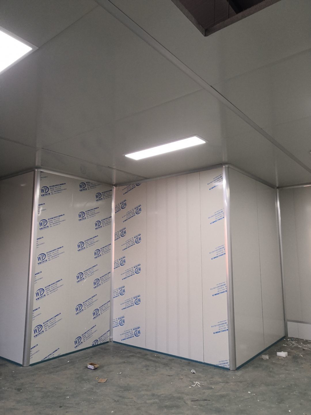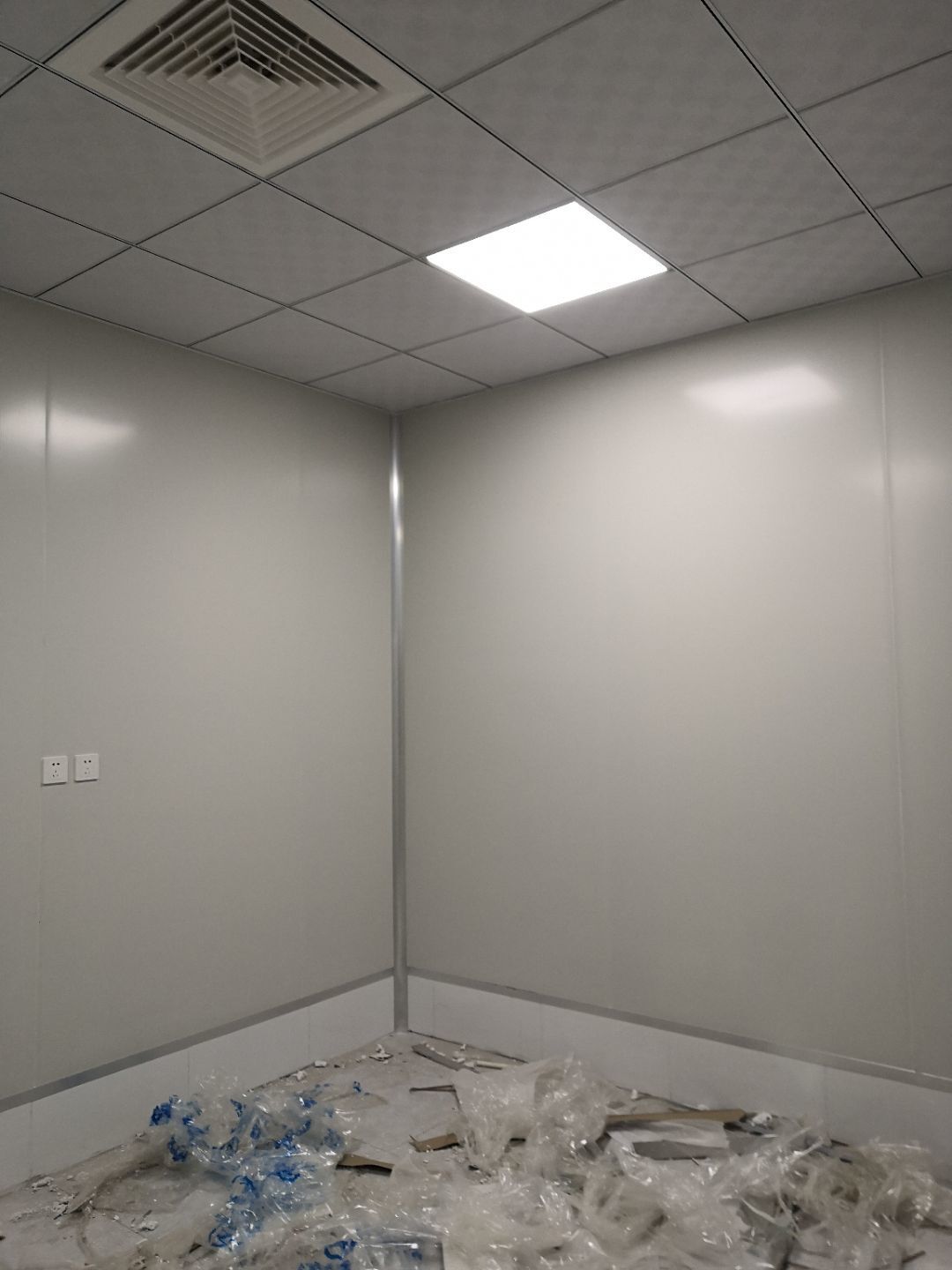 1.打膠,拍圓弧,做風(fēng)淋室,裝觀察窗 2.吊三防板 3.三防板裝燈,開關(guān),插座