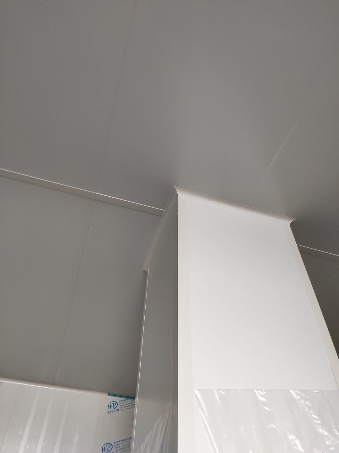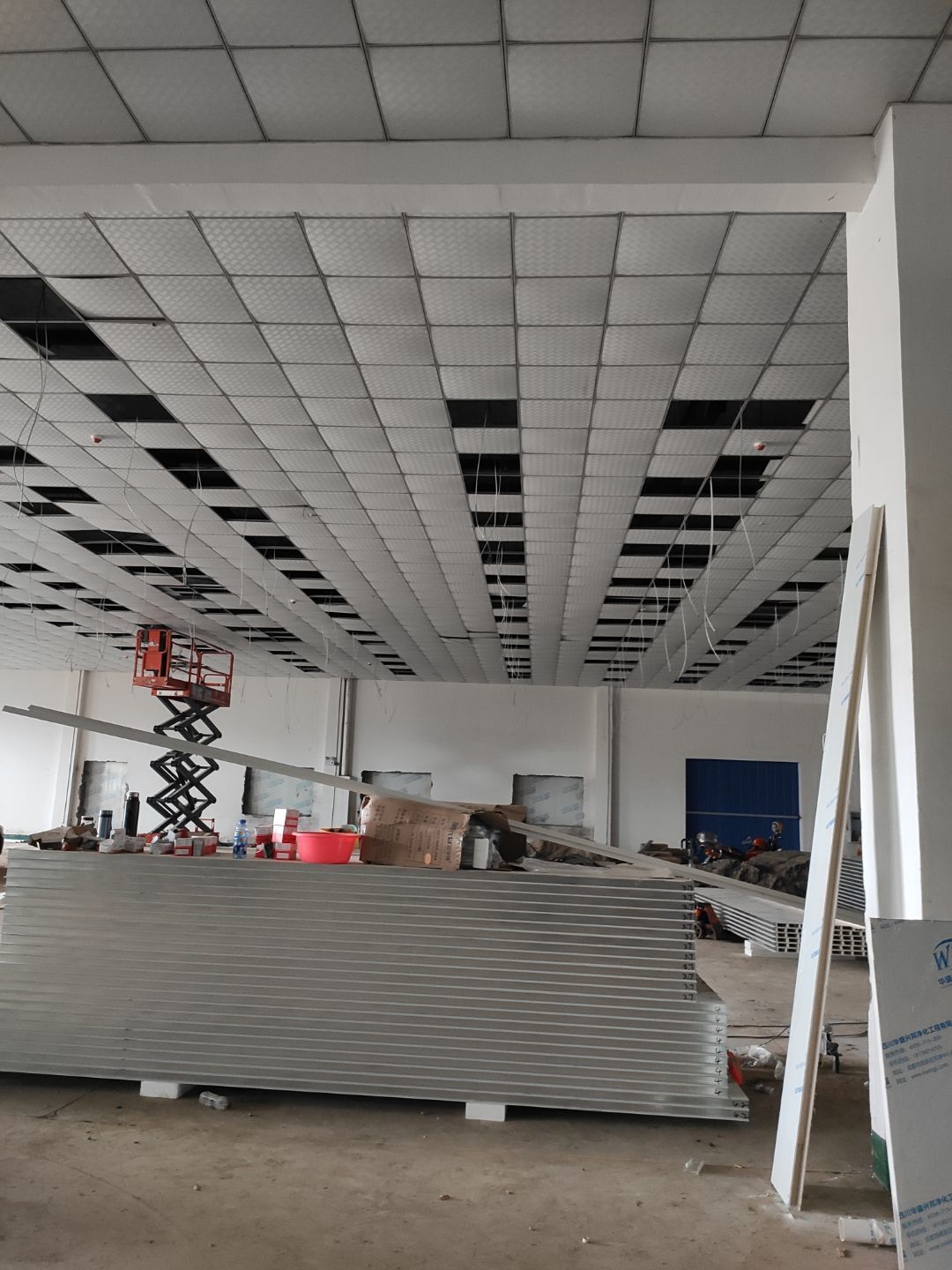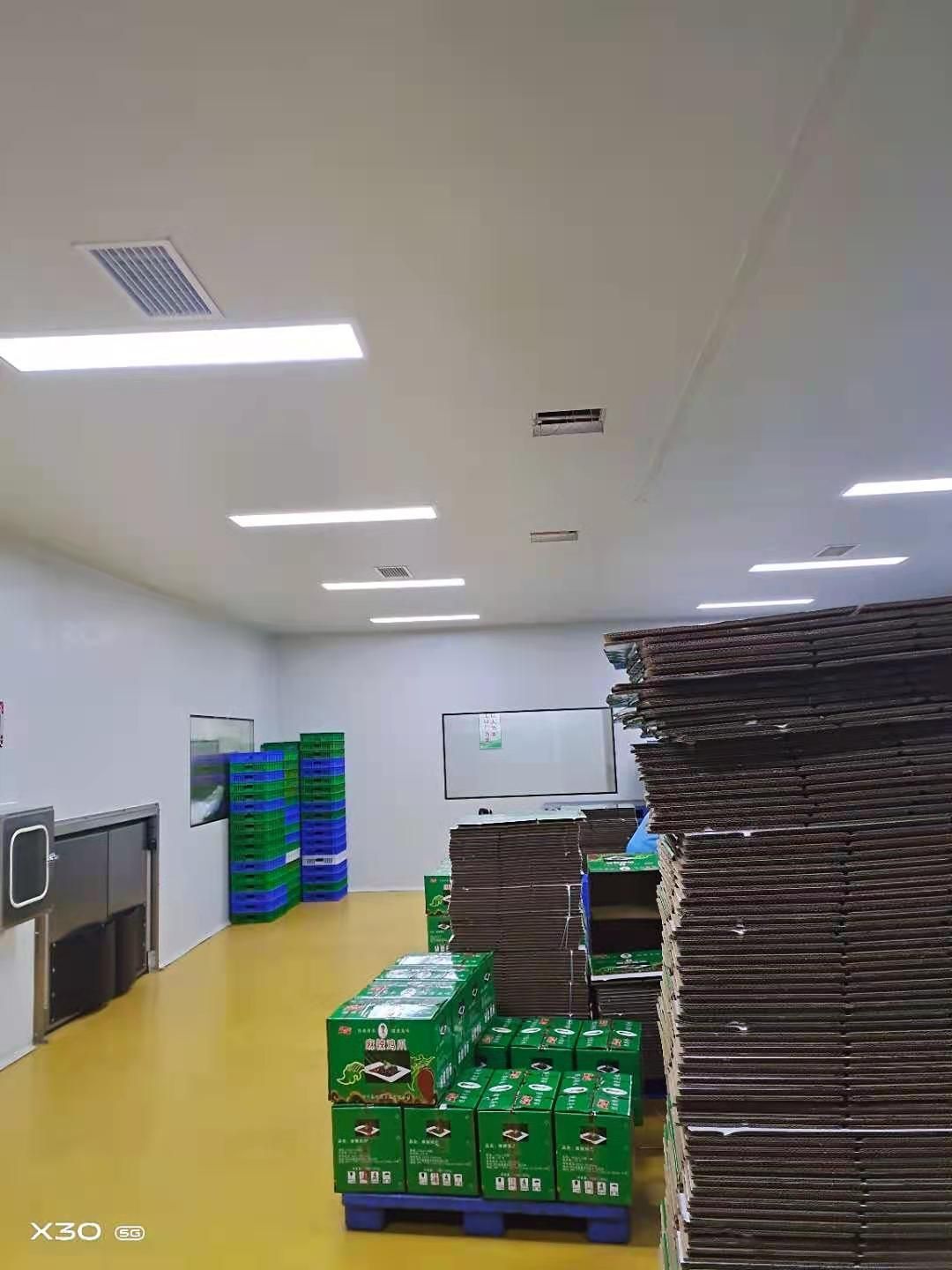 周轉框清洗間彩鋼板吊頂安裝完成,庫房撕膜打膠完成,周轉框清洗間彩鋼瓦墻板安裝完成。撕膜完成40%,圓弧安裝完成50%。