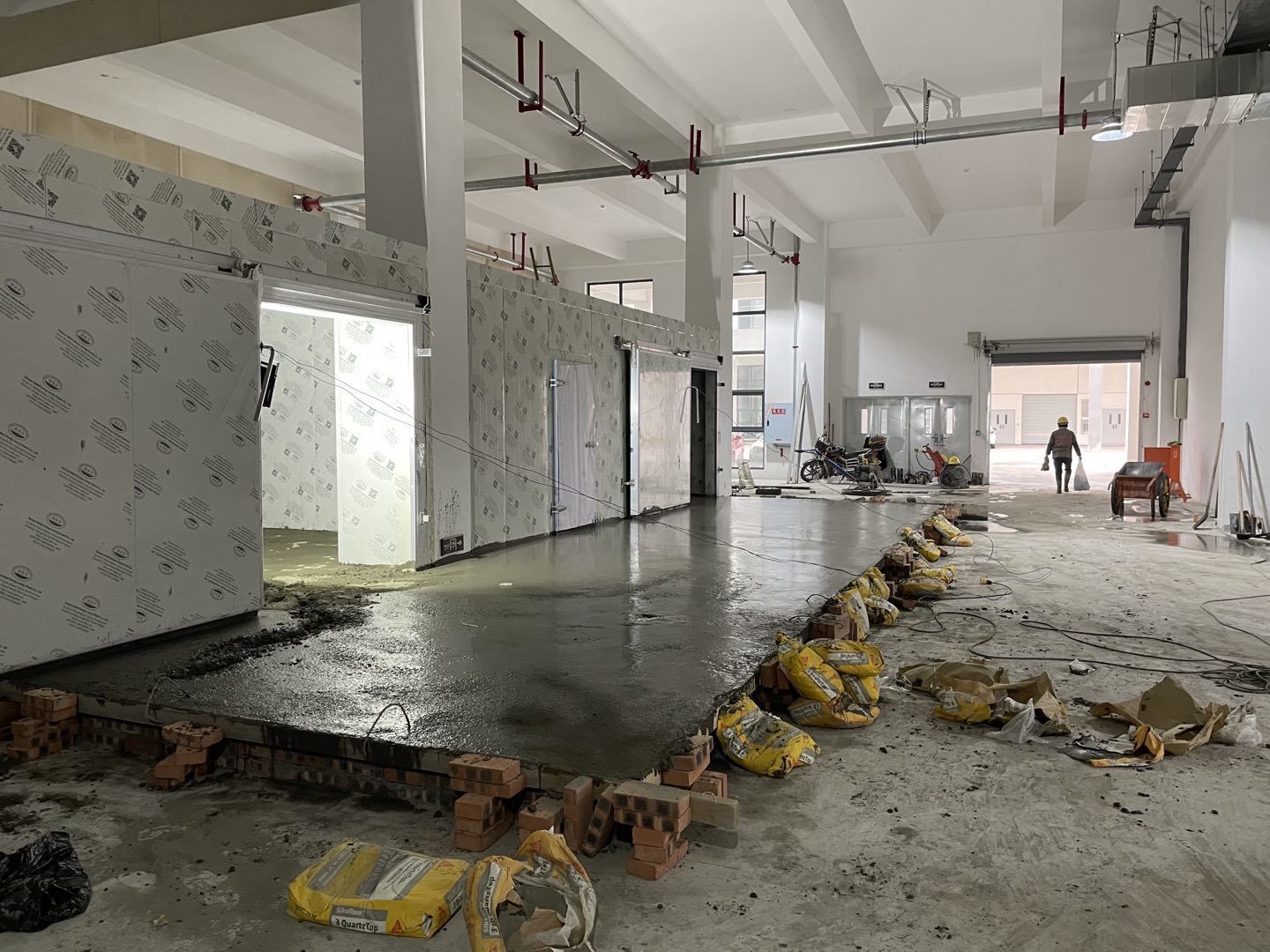1. 擋水墻防水涂抹。2.水磨石墊層完成。3.凍庫金剛砂地坪完成