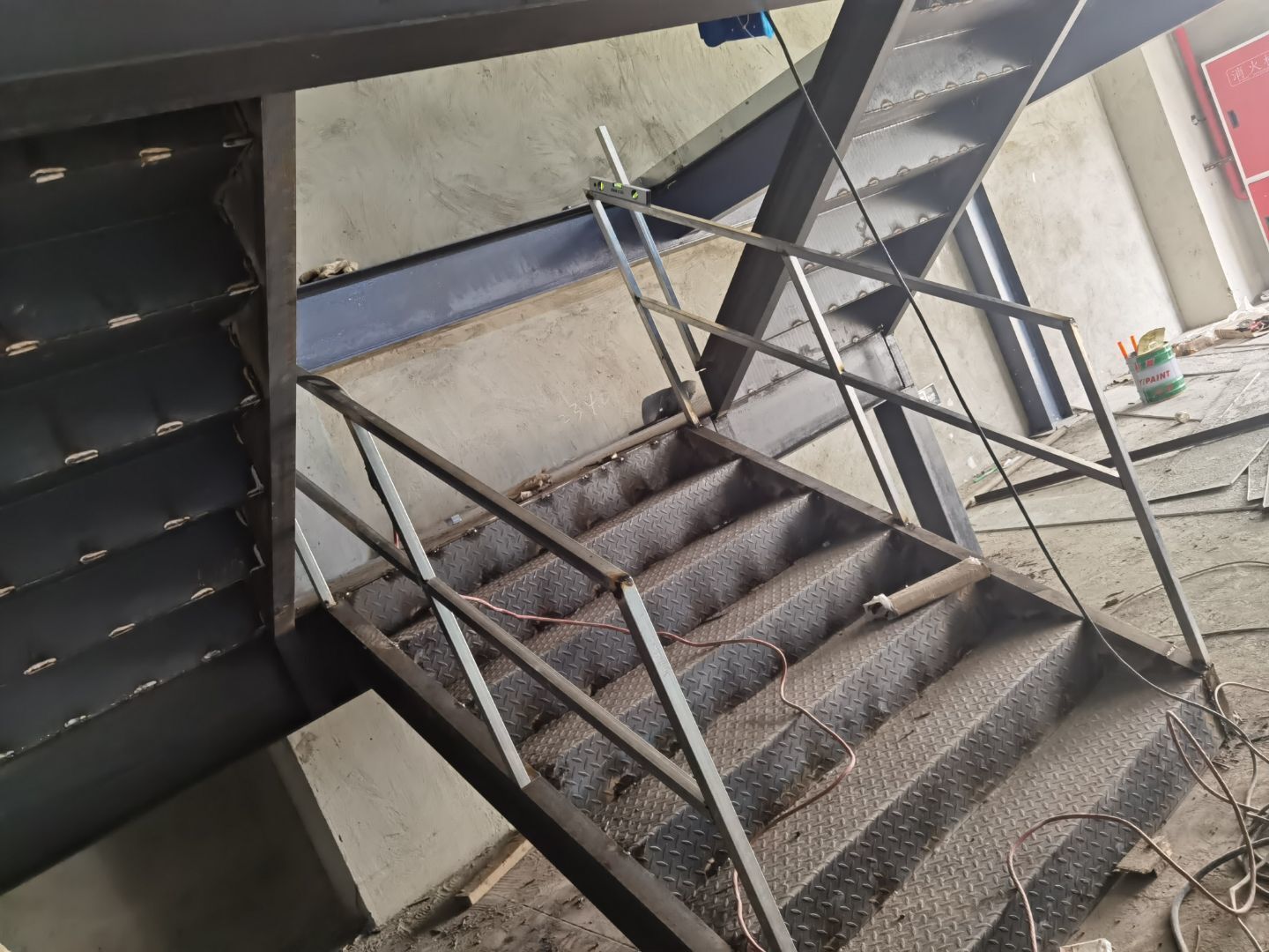 1彩板一樓隔墻安裝;2二三樓打膠 收圓弧;3二三樓燈線敷設;4二三樓風口安裝;5樓梯貼磚;6一層貼磚。
