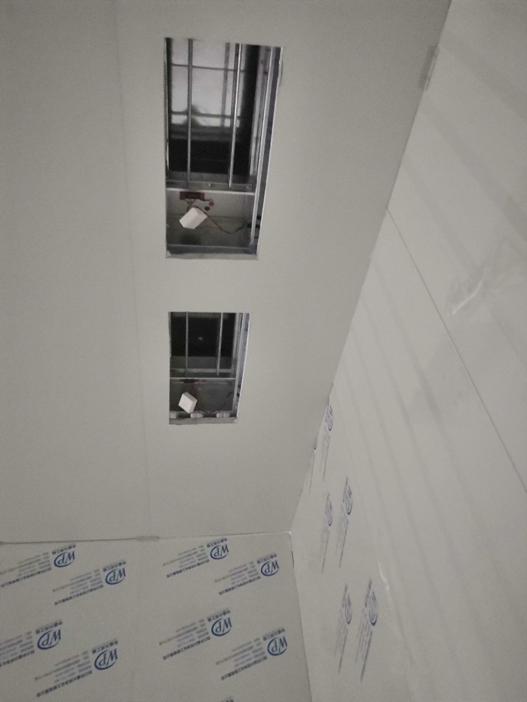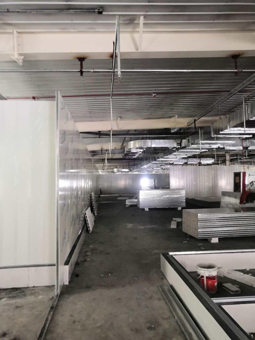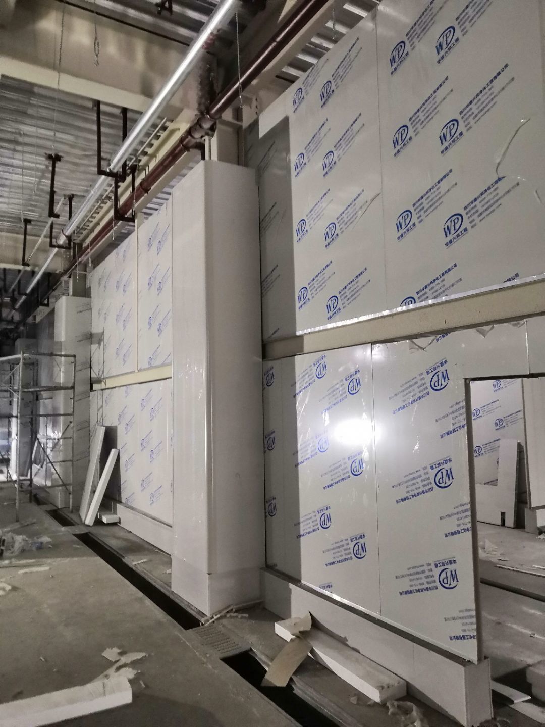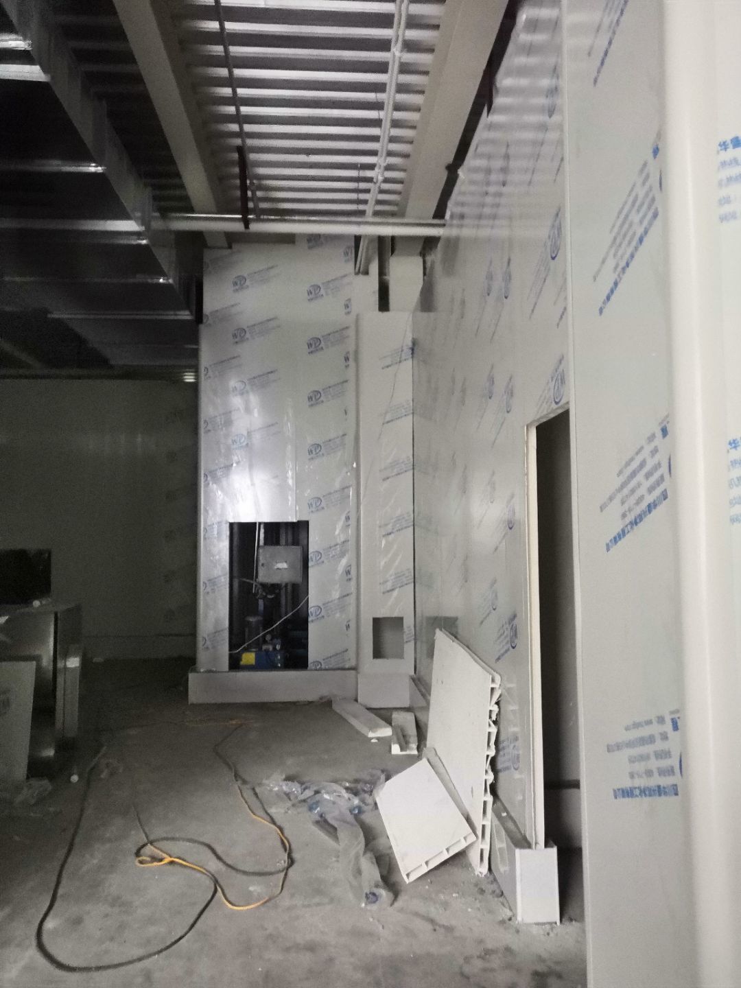 1.一樓樓梯間立墻板完成100%; 2一樓通道排燈線,二樓參觀通到排線;3. 電梯立墻板,一樓接臭氧管子90%。
