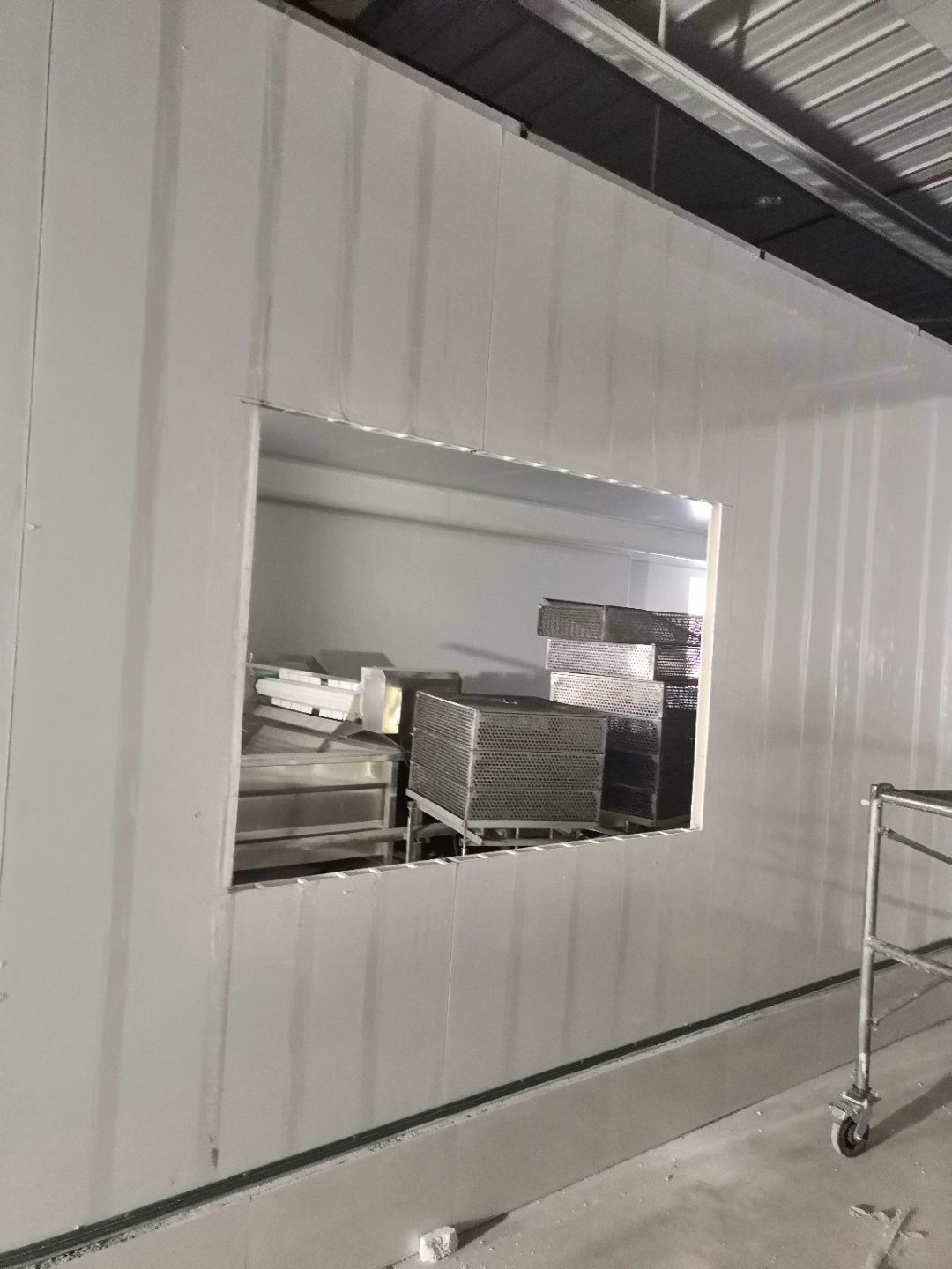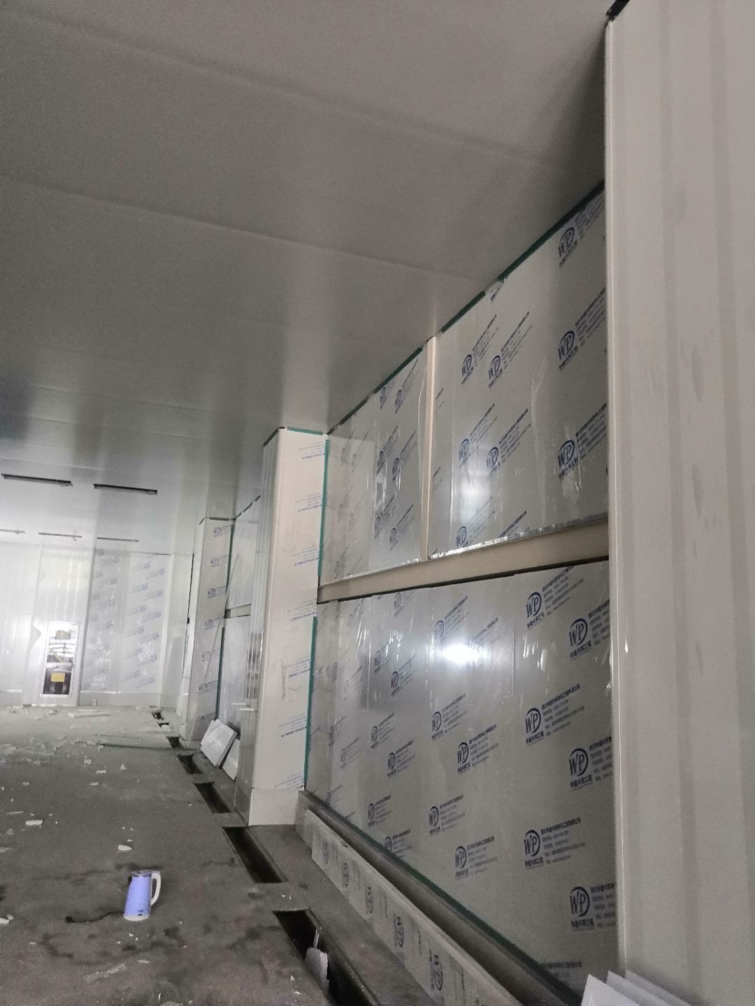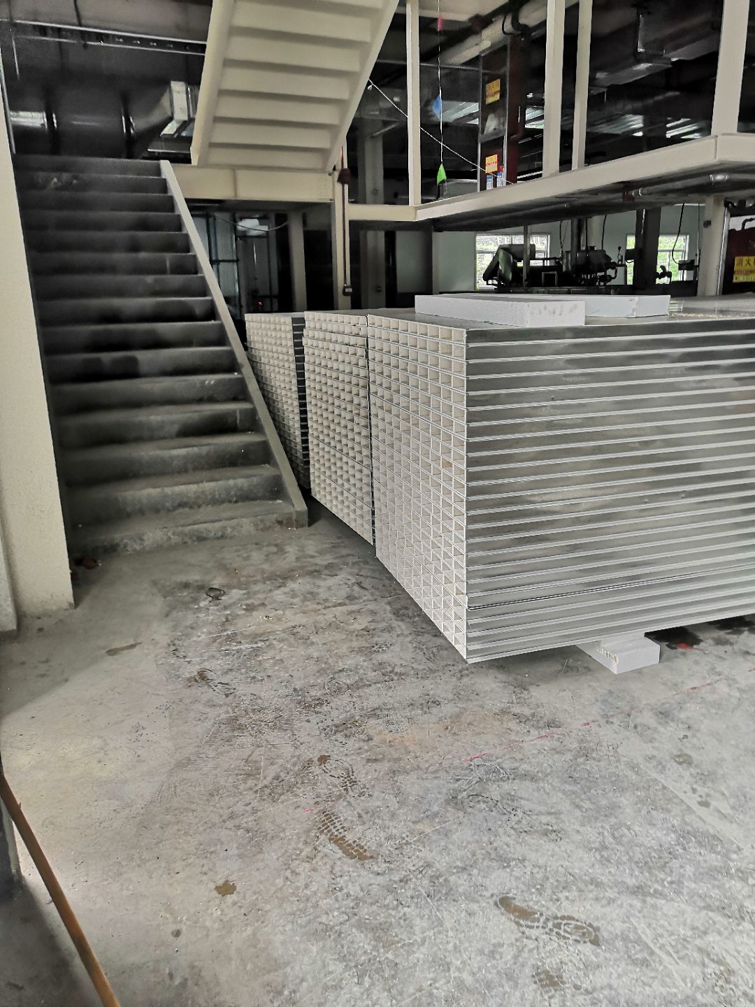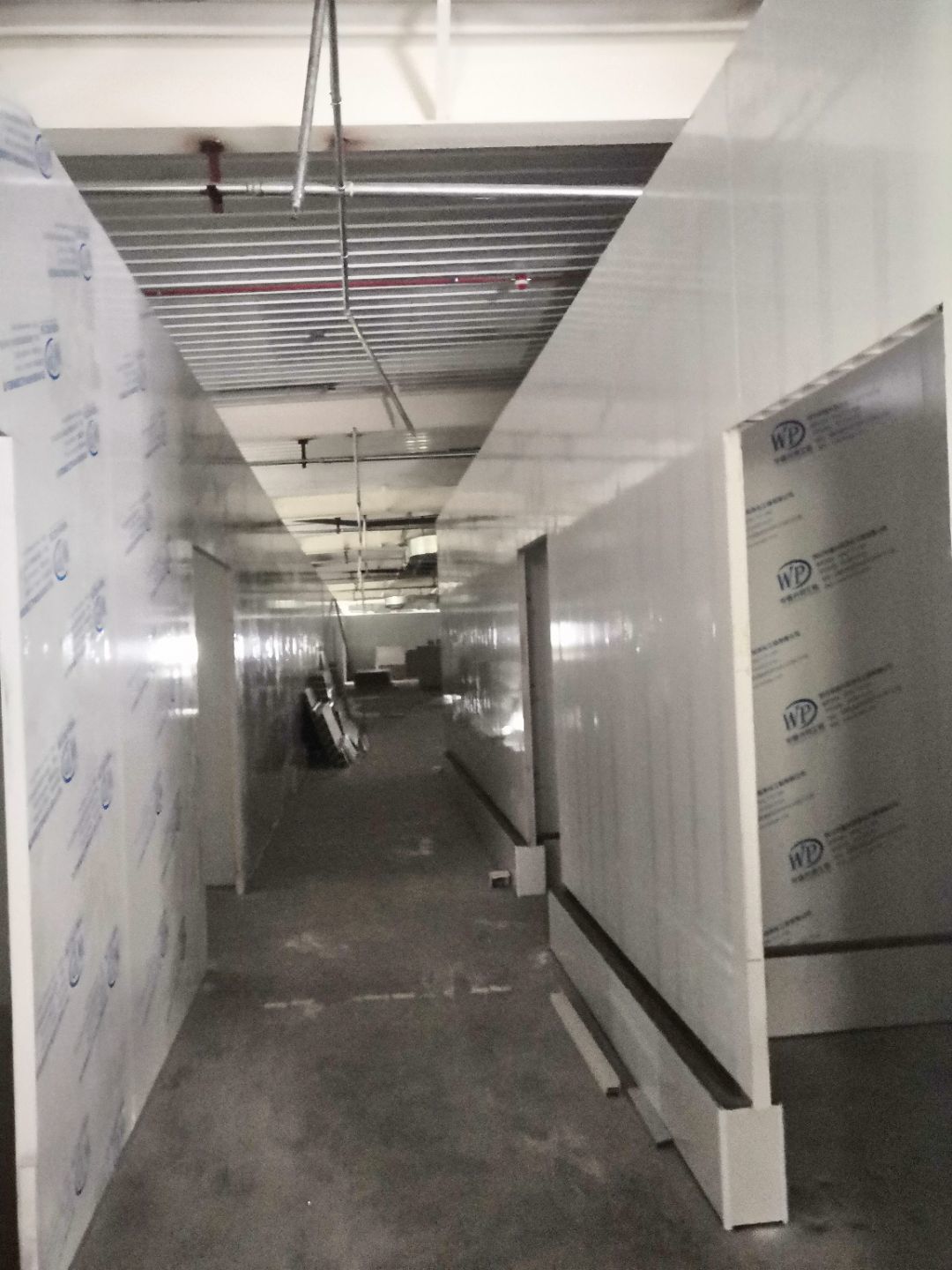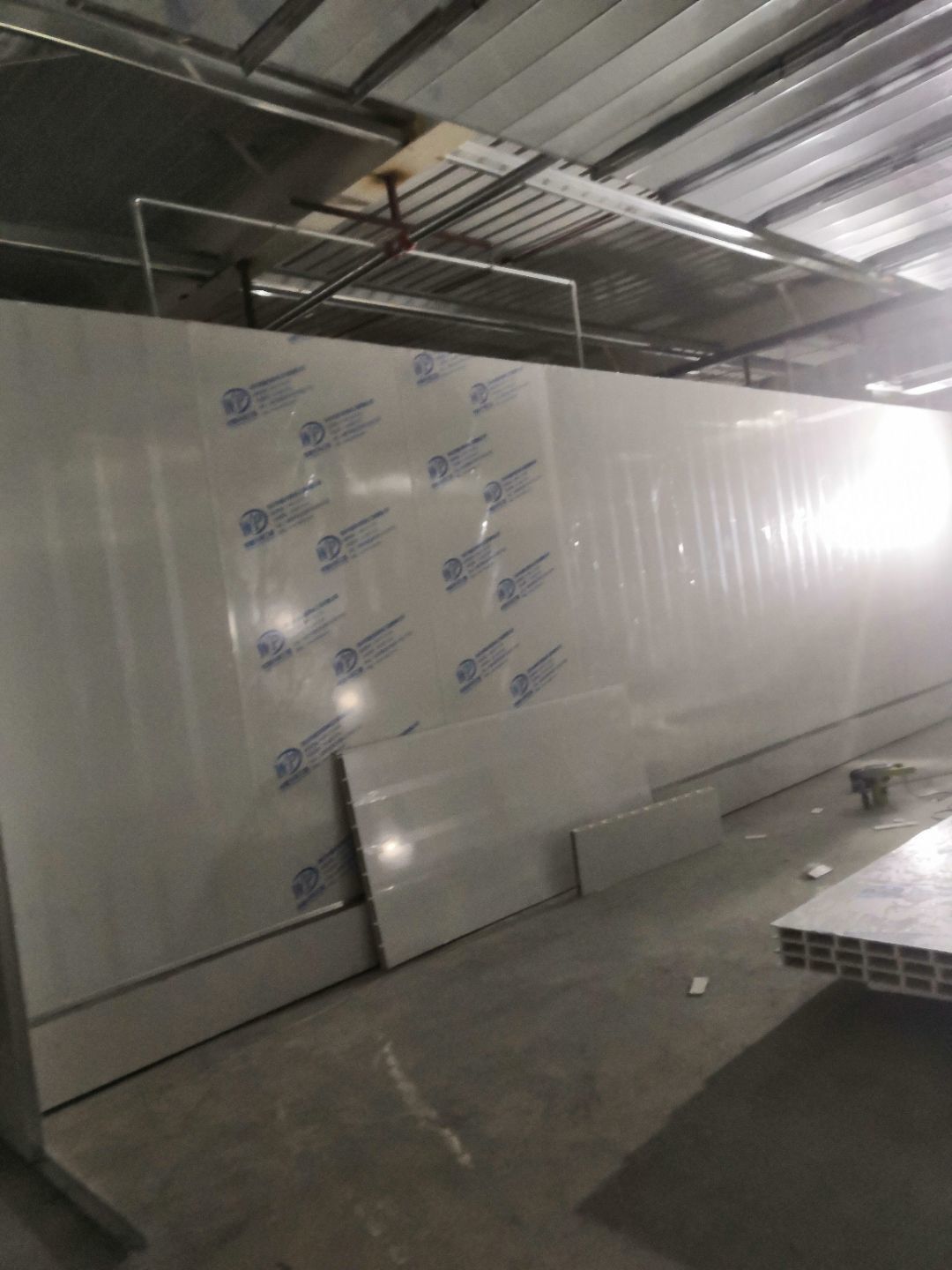 1.一樓樓梯間立墻板完成100%; 2一樓通道排燈線,二樓參觀通到排線;3. 電梯立墻板,一樓接臭氧管子90%。
