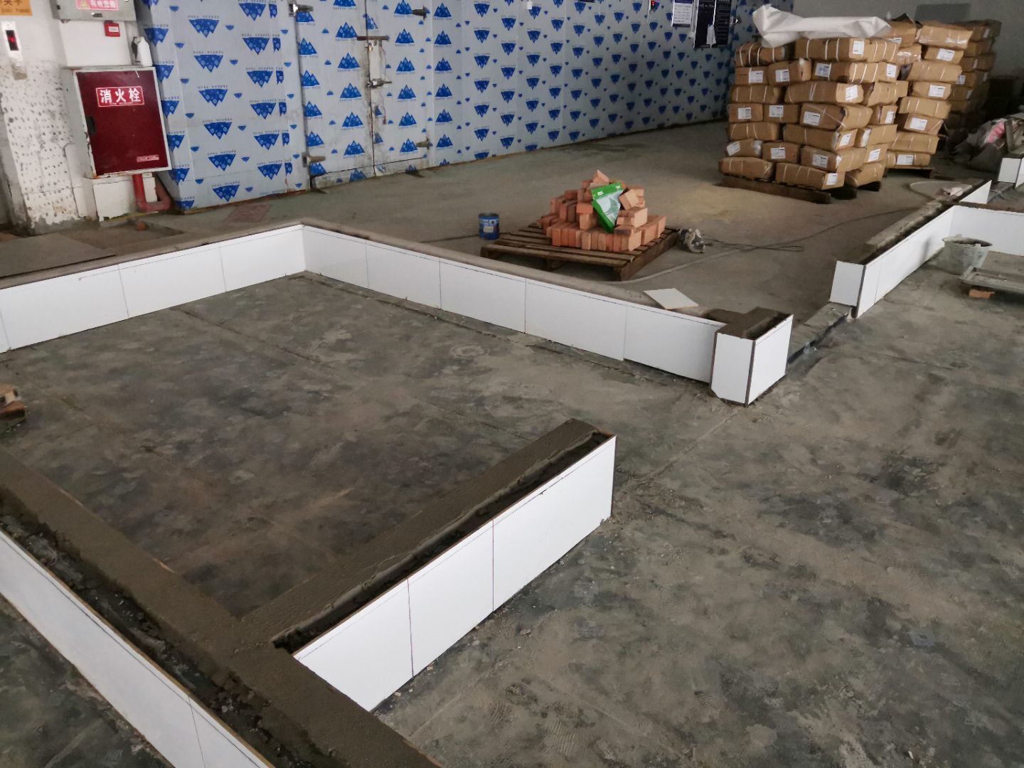 1、擋水墻磚砌完成,貼磚完成90%(剩余待彩鋼墻板完成后進行); 2、地面標高控制線完成,靶點完成; 3、門洞補爛完成25%;4、排水管安裝,SBS防水完成,凍庫丙綸防水完成。
