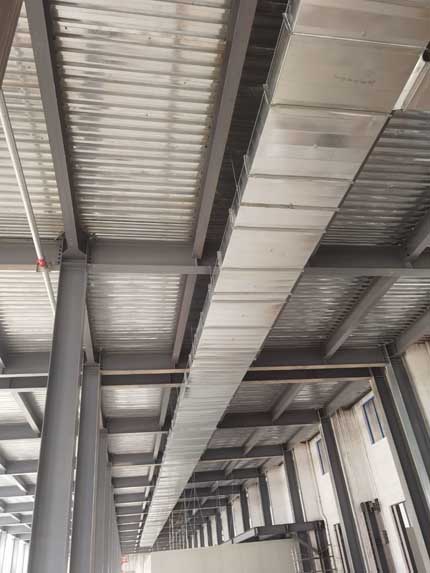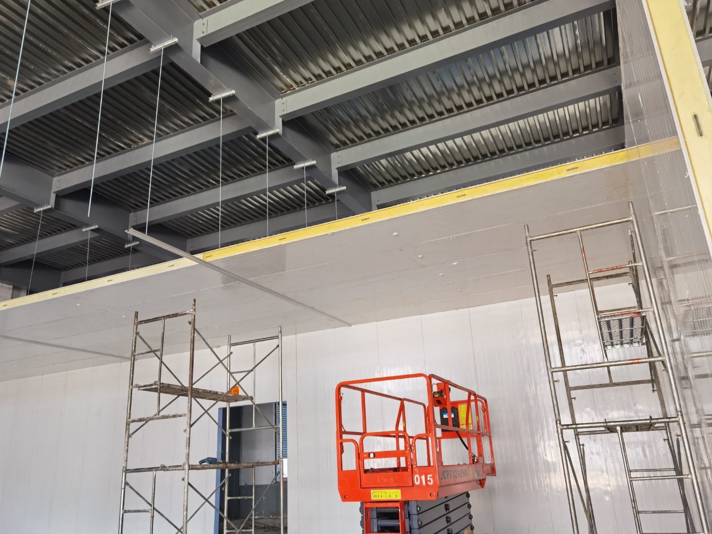 1,一樓彩板吊筋安裝 2,一樓鋼構頂刷漆 3,一層鋼構平臺焊接施工 4,一樓凍庫門體安裝 5,一樓空調新風管吊裝 6,門衛室墻體砌筑 7,電梯施工