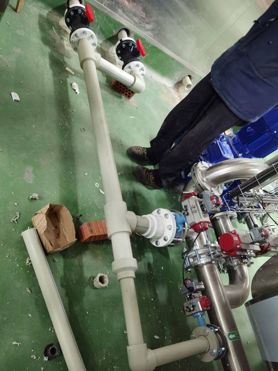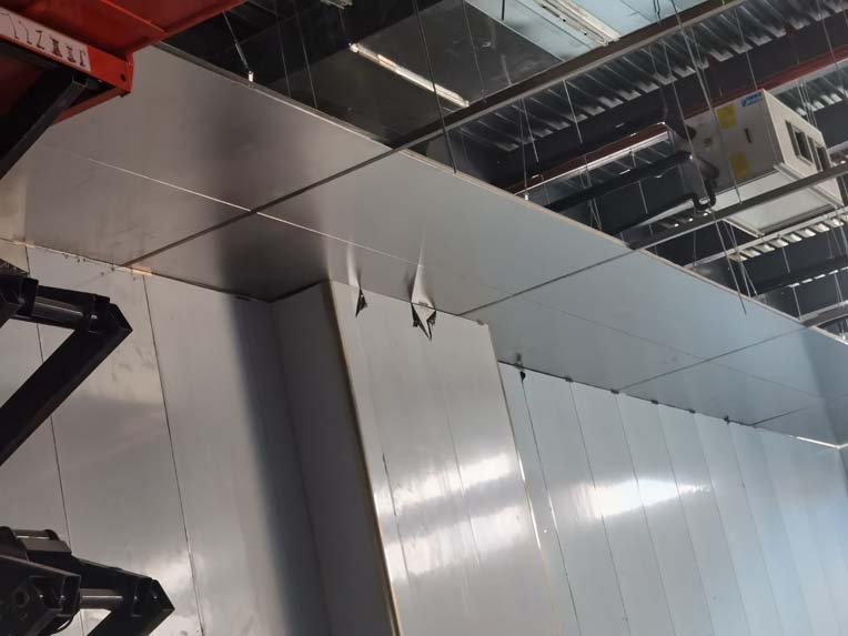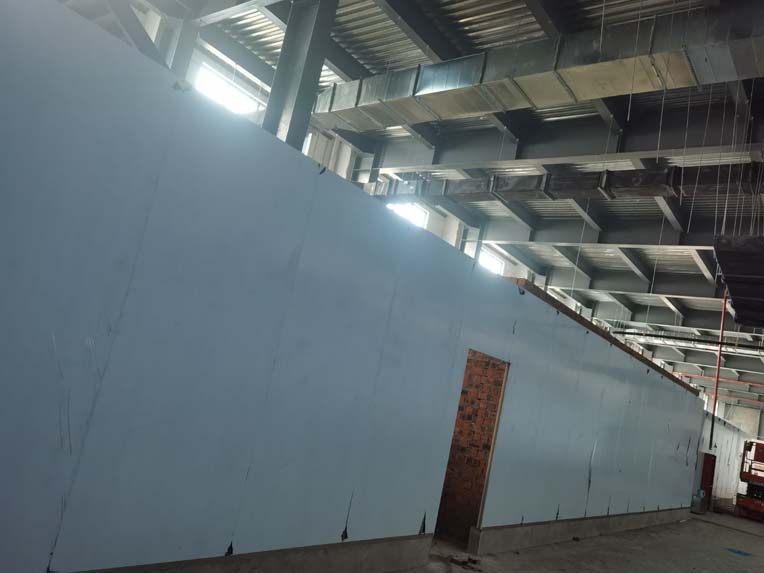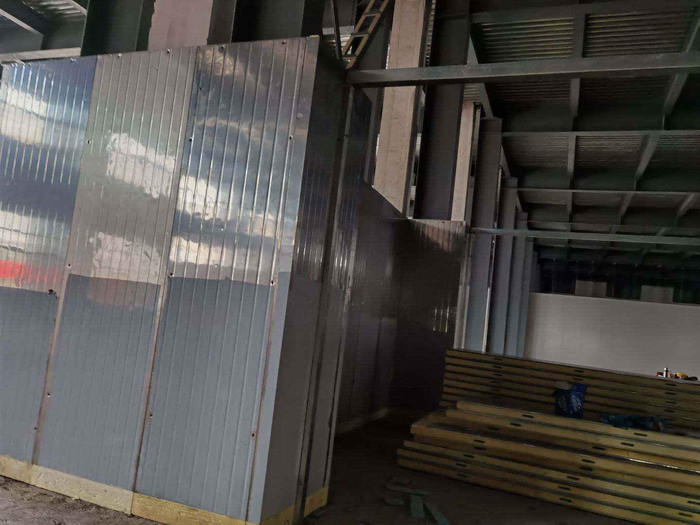 今日施工內容 1,彩板拍圓弧 打膠 2, 二層鋁扣板安裝 3,二層風管軟接 4,一層地坪施工 5,凍庫冷媒管安裝 6,二層墻板安裝 7,一層消防煙感安裝 8,蒸汽管道施工 9,門體安裝 今日材料進場 彩板 消防主水管 工藝設備