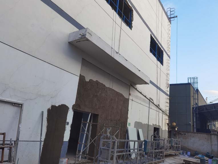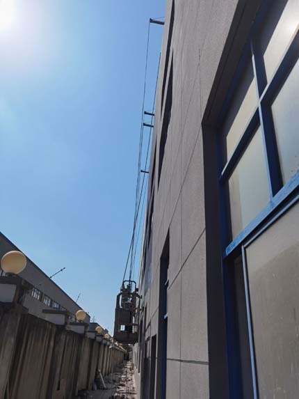今日施工內容 1,彩板立板安裝 打膠條 2,二樓動力電橋架安裝 3,一樓電梯安裝 4,一層燈具布線管 5,一層消防水管安裝 6,西面室外外墻噴真石漆 7,南面鋼結構施工 8,地坪開始施工