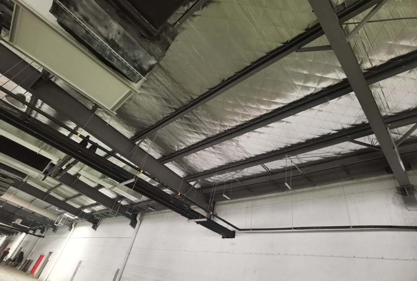 今日施工內容 1,彩板墻頂板安裝 2,一層擋水墻抹灰 3,一層動力電橋架安裝 4,一層地坪施工 5,外墻真石漆施工 6,一層照明安裝 7,一層風管保溫安裝