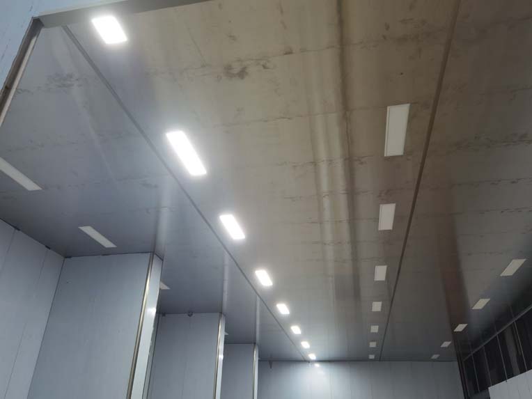 今日施工內容 1.二層彩板安裝 2, 一層門體安裝 3,監控施工布線 4,參觀通道原子灰開始補縫 5,設備就位 6,配電箱壓線頭 7,二樓煙感安裝 8,室外污水池墊層澆筑