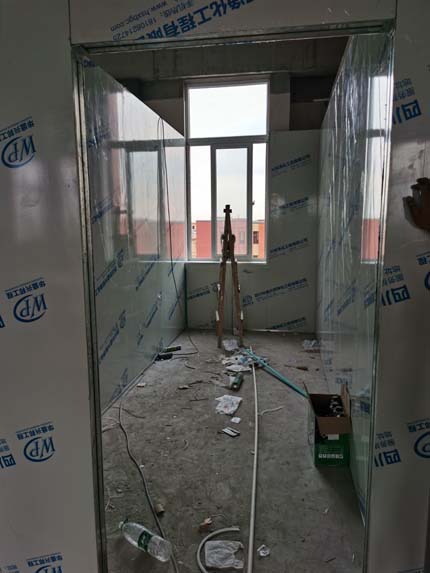 ①彩鋼墻板立板完成60% ②衛生間土建施工完成100% ③ 凍庫制作安裝完成80% ④ 衛生間鋁扣板吊頂已完成100