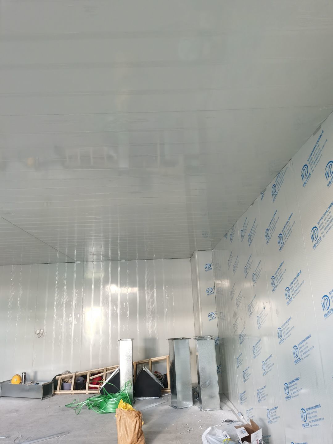 1,彩鋼墻板立板除預留設備外完成100% 2,彩鋼板吊頂除預留外,完成95% 3,三防板吊頂完成100% 4,水電安裝完成60% 5,彩鋼板收尾工作完成50%