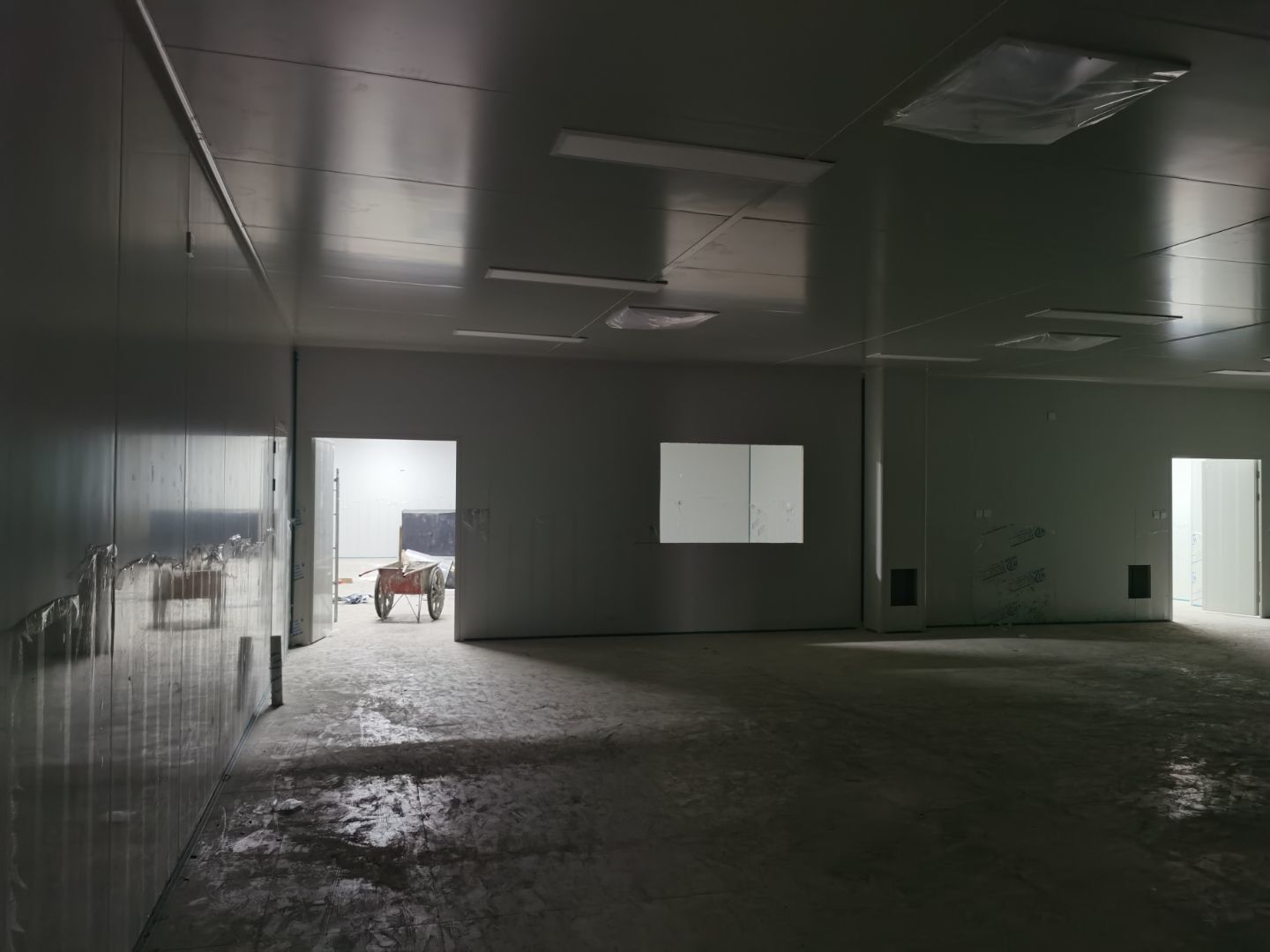 1,彩鋼墻板立板除預留設備外完成100% 2,彩鋼板吊頂除預留外,完成95% 3,三防板吊頂完成100% 4,水電安裝完成70% 5,彩鋼板收尾工作完成60% 6,聚氨酯超耐磨地坪漆,完成90%