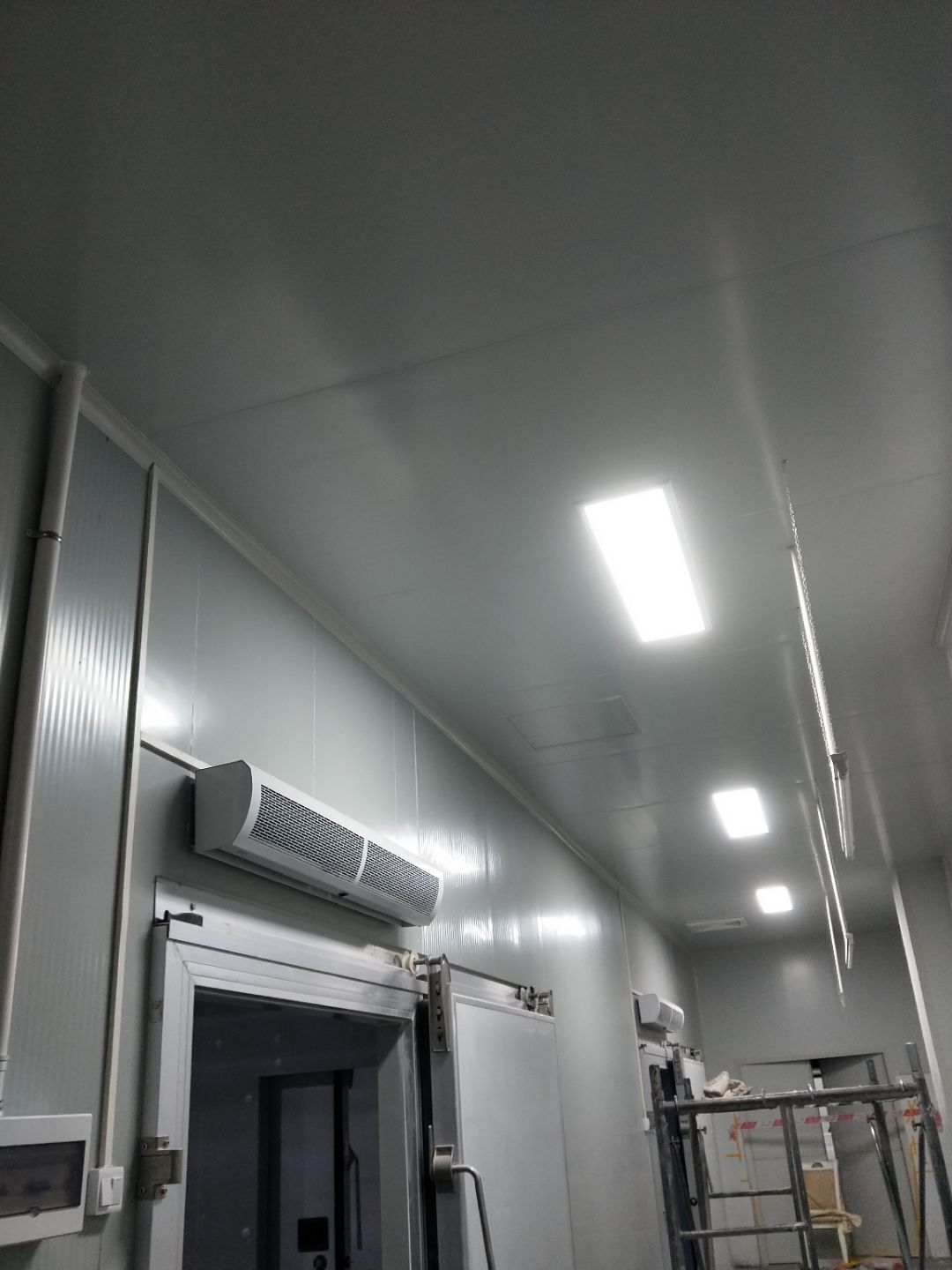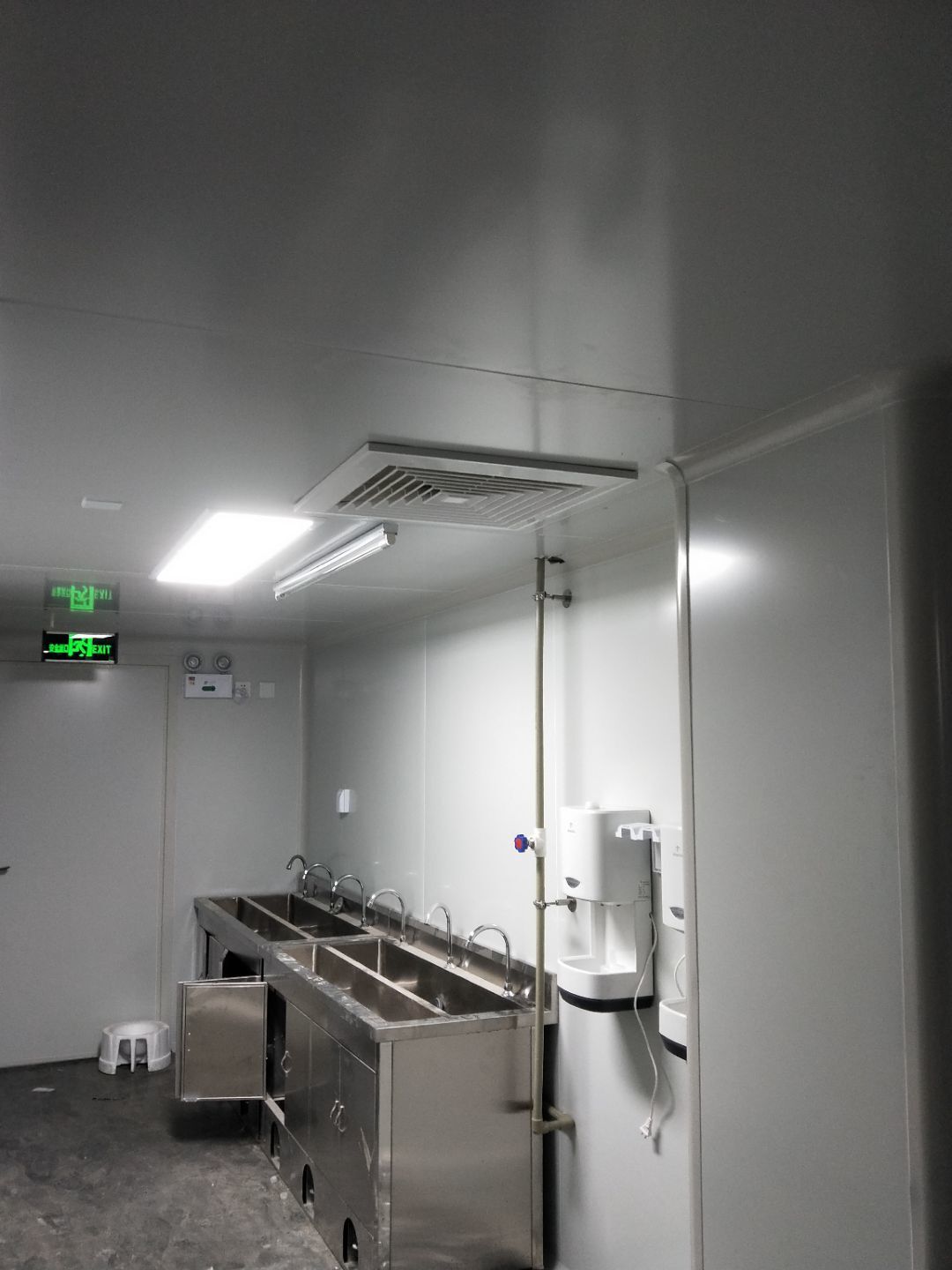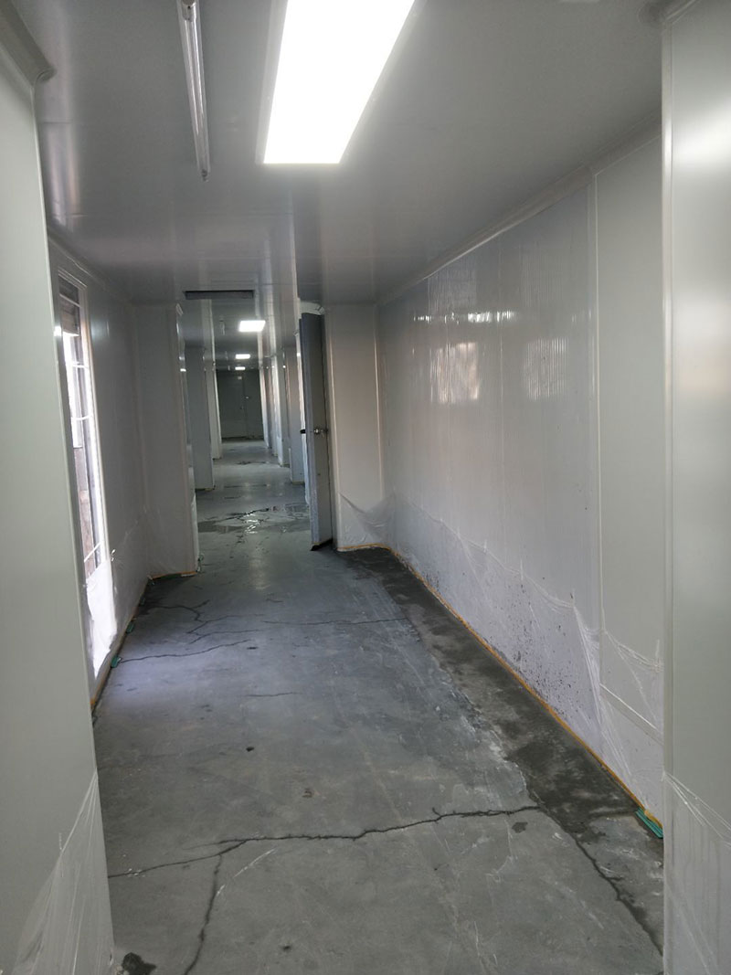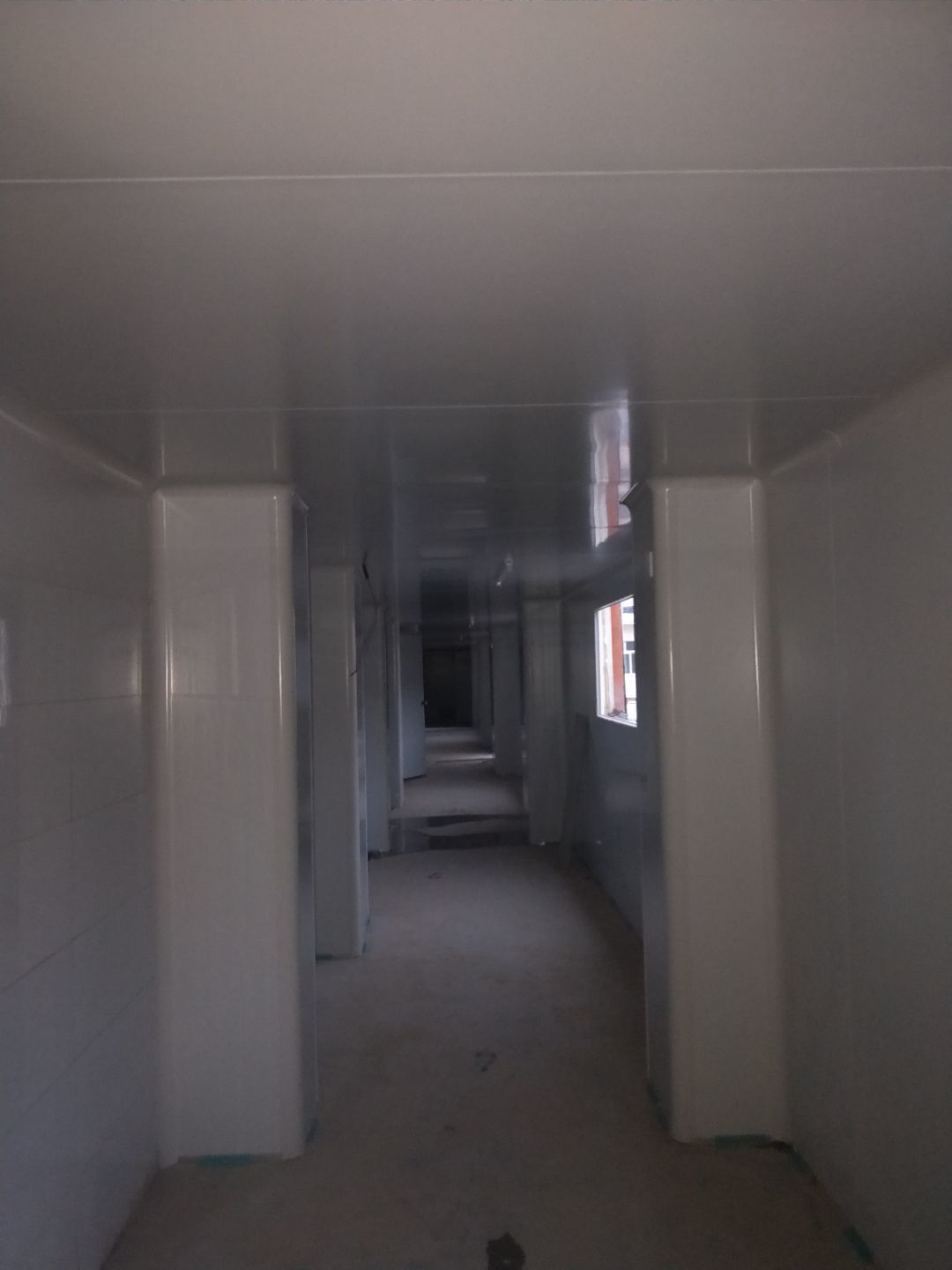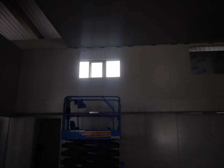 1:彩鋼墻板完成98% 2:彩鋼頂板完成100% 3:撕膜打膠完成98% 4:自制門窗完成95% 5:水電完成75% 6:圓弧完成85% 7:金剛砂完成100% 8:三防板吊頂完成100% 9:地面固化完成100% 10:動力電完成60% 11:空調安裝完成100%