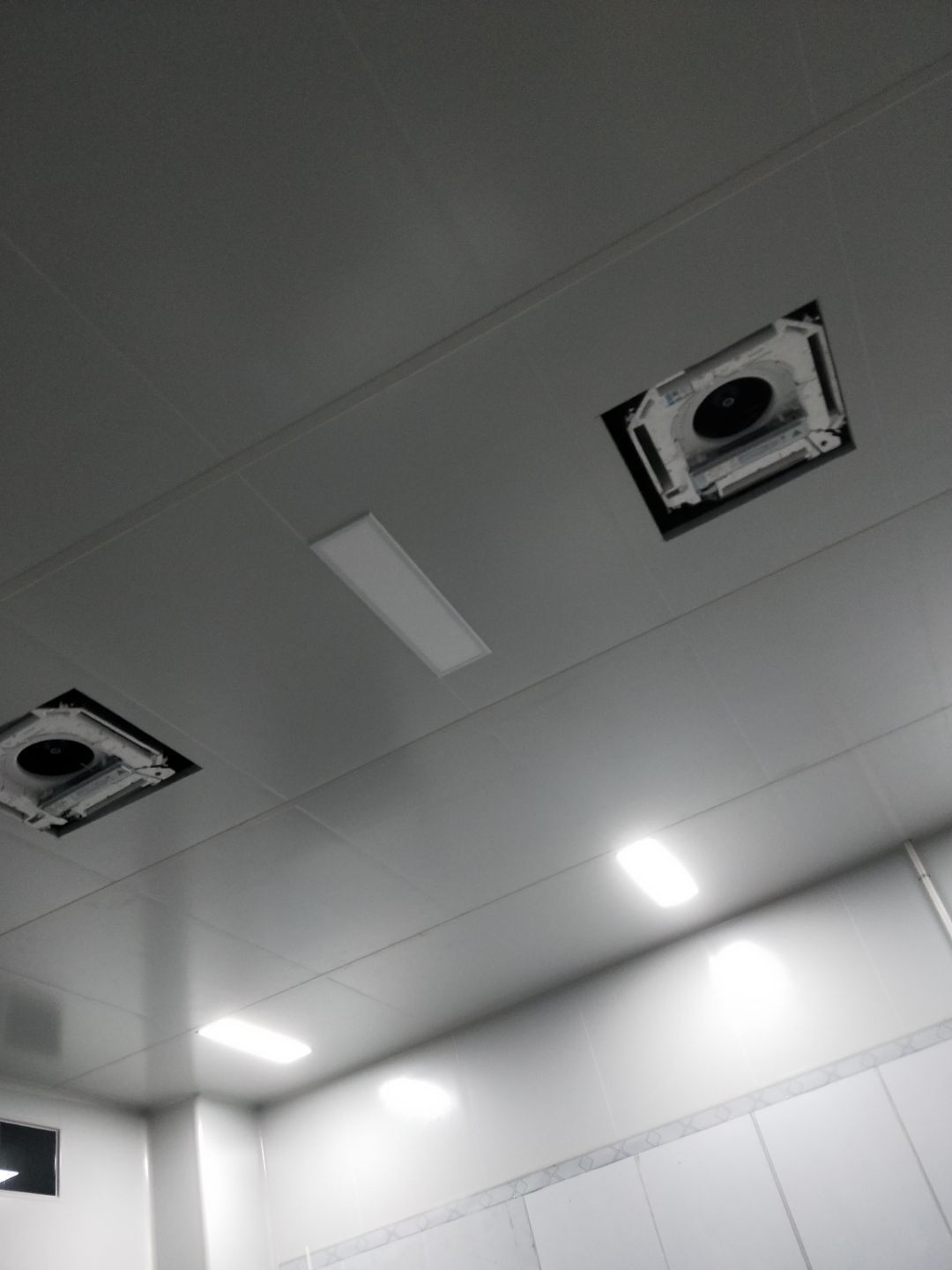 1:彩鋼墻板完成100% 2:彩鋼頂板完成100% 3:撕膜打膠完成98% 4:自制門窗完成95% 5:水電完成100% 6:圓弧完成97% 7:金剛砂完成100% 8:三防板吊頂完成100% 9:地面固化完成100% 10:動力電完成100% 11:空調安裝完成100% 12:聚氨酯地面完成100% 13:理化室新增墻板和吊頂完成100% 14:PVC地坪完成100%