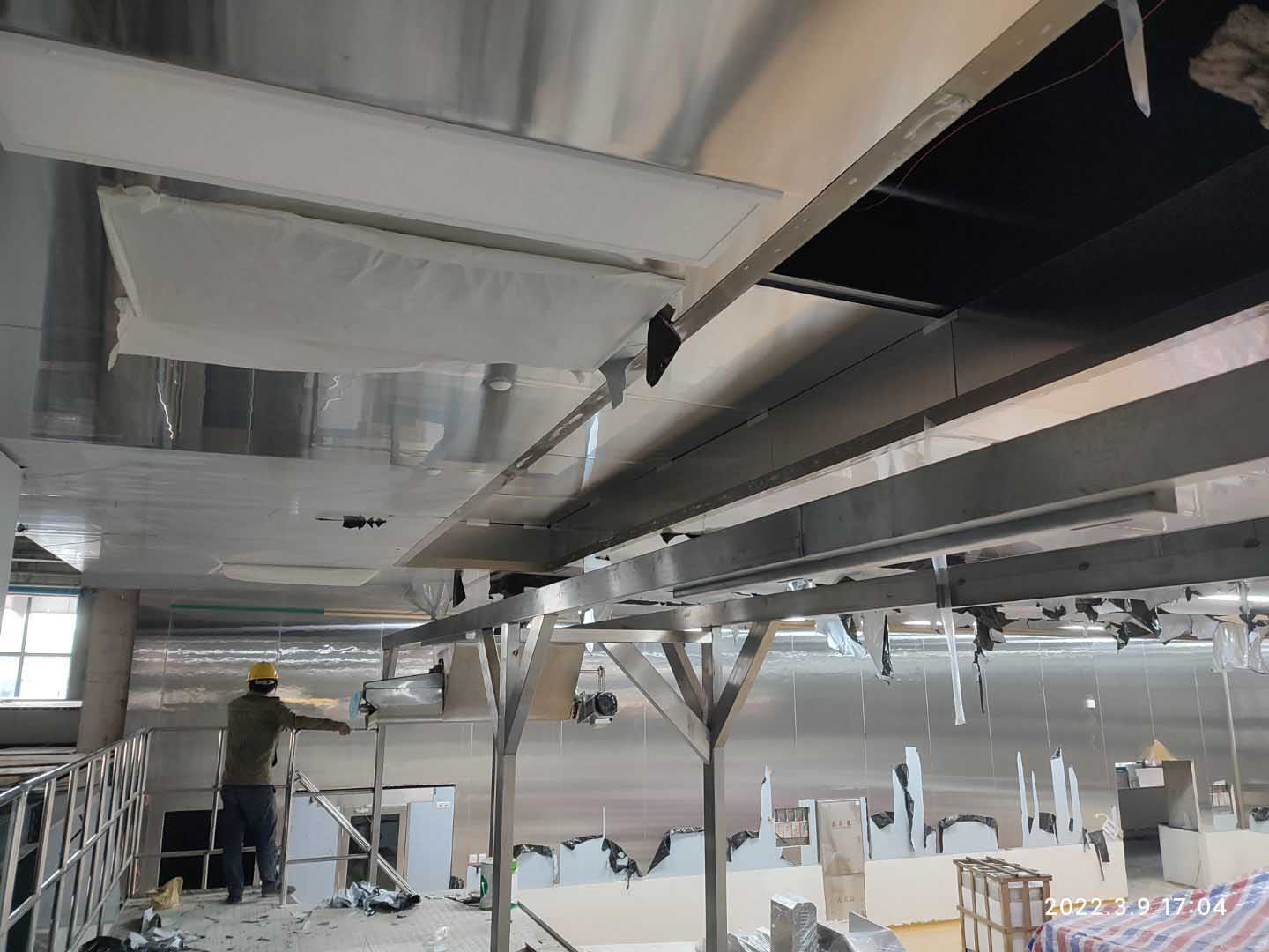 1,風管主管安裝及保溫完成80%; 2,鋼結構構件預制完成70%,安裝完成30%; 3,彩鋼板墻板完成3%,頂板吊筋安裝完成10%