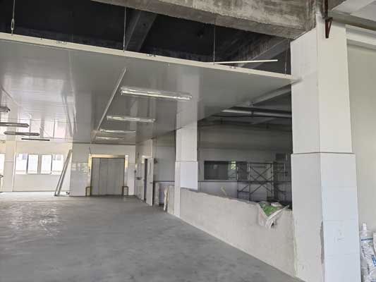 1,彩鋼墻板施工第20天,除預留區域外完成進度100% 2,彩鋼頂板施工第30天,完成進度99%。 3,水電照明安裝施工第44天,除動力電外,完成進度80% 4,擋水墻貼瓷磚施工第31天,完成進度100% 5,彩鋼板收尾工作第34天,完成進度70% 6,新增衛生間隔斷項目,施工第2天,完進度100% 7,新增包柱子施工第19天,完成進度100% 8,原有紗窗已完成全部換新 9,原有土建墻體已完成全部乳膠漆
