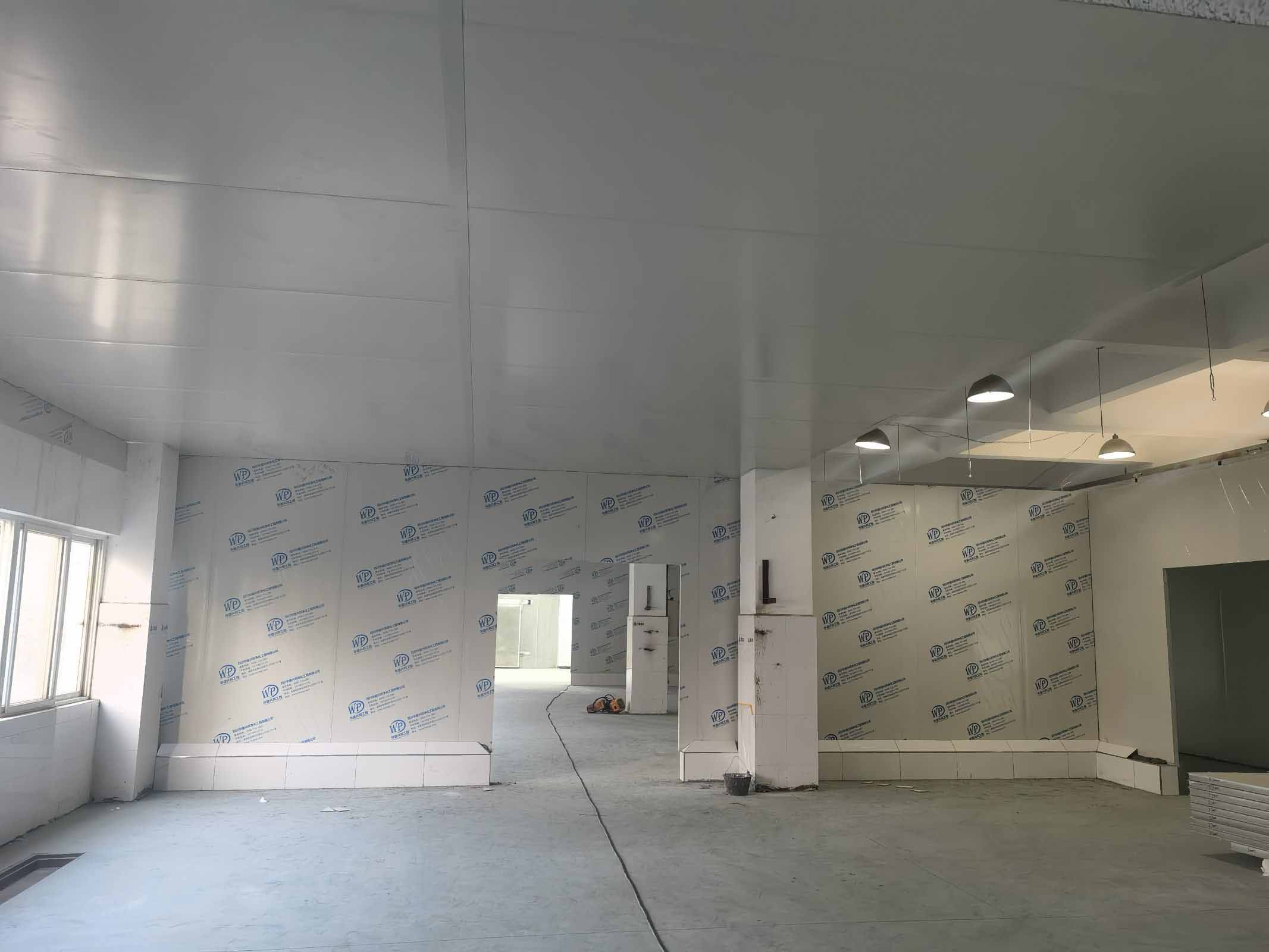 1,彩鋼墻板施工第20天,除預留區域外完成進度100% 2,彩鋼頂板施工第9天,完成進度55% 3,水電照明安裝施工第8天,完成進度40% 4,擋水墻貼瓷磚施工第19天,完成進度85% 5,現場衛生清理及清運