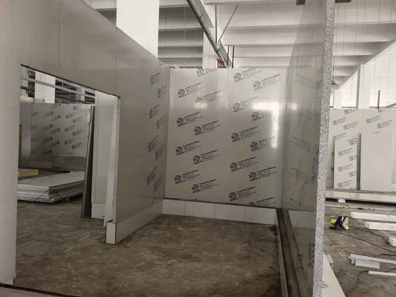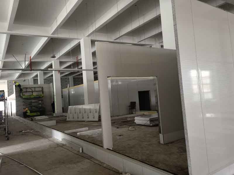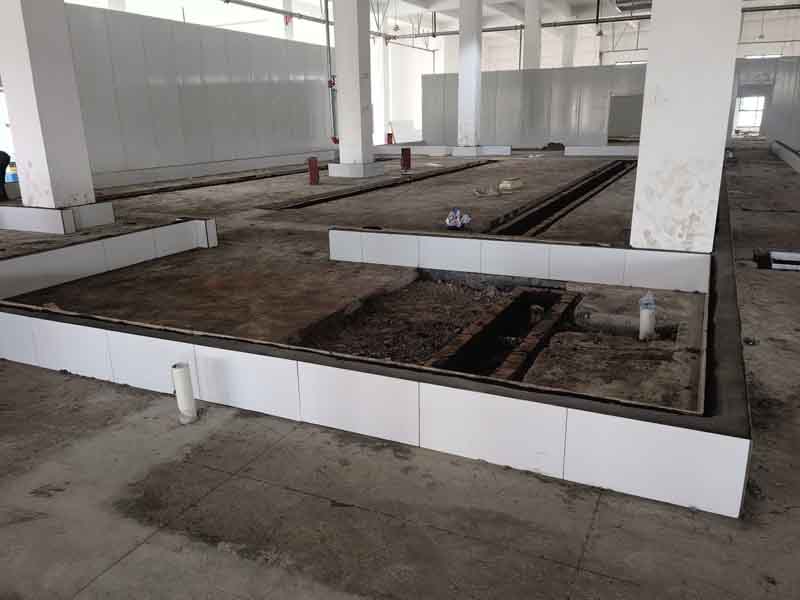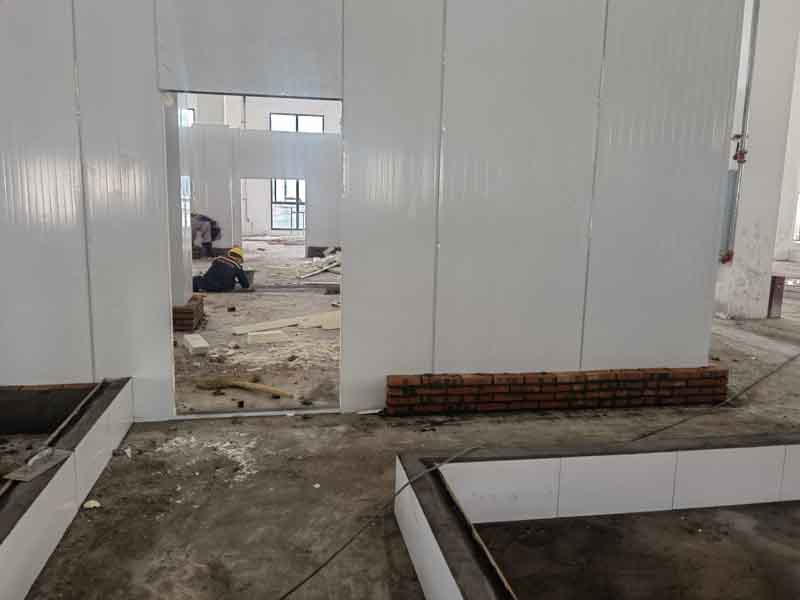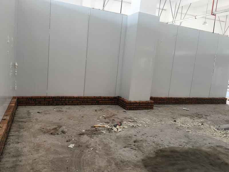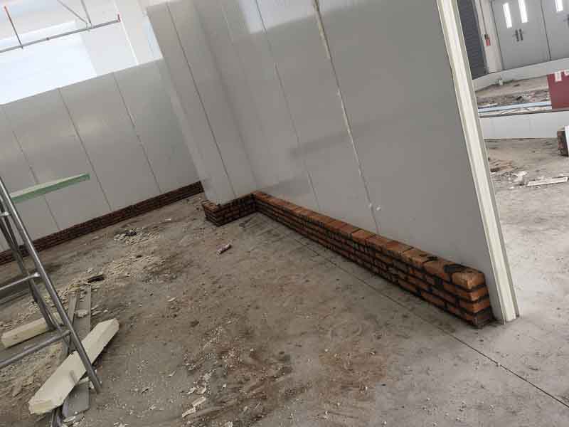 1,凍庫內外砌磚已完成 2,排水明溝貼瓷磚施工第1天,完成分項施工40% 3,擋水墻砌墻施工第5天,完成分項工作100% 4,擋水墻貼瓷磚施工第4天,完成分項施工進度80% 5,彩鋼板立墻板施工第2天,完成分項施工進度10%