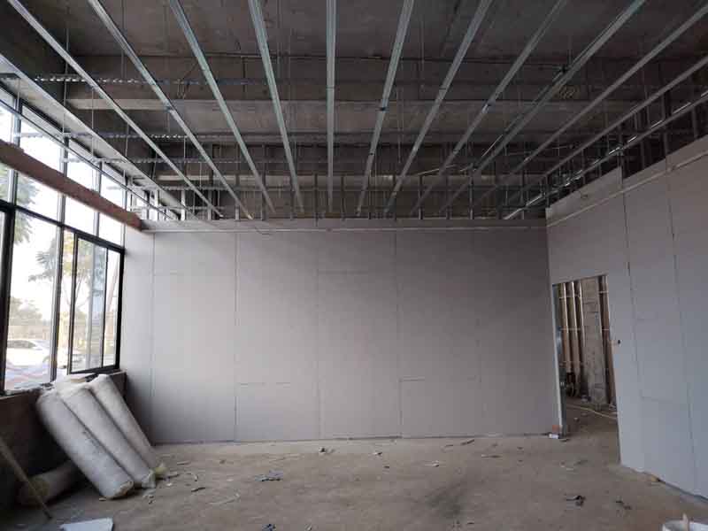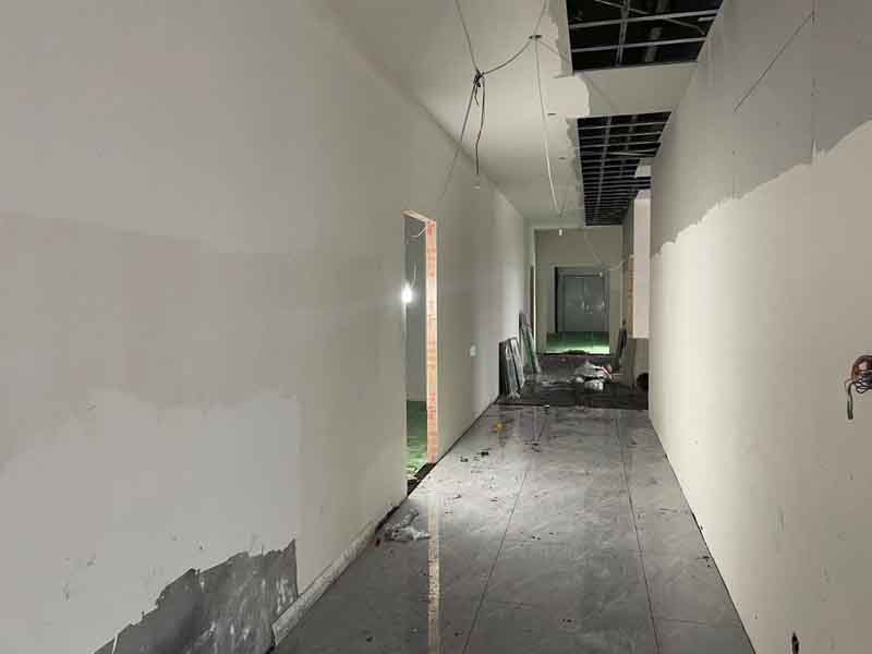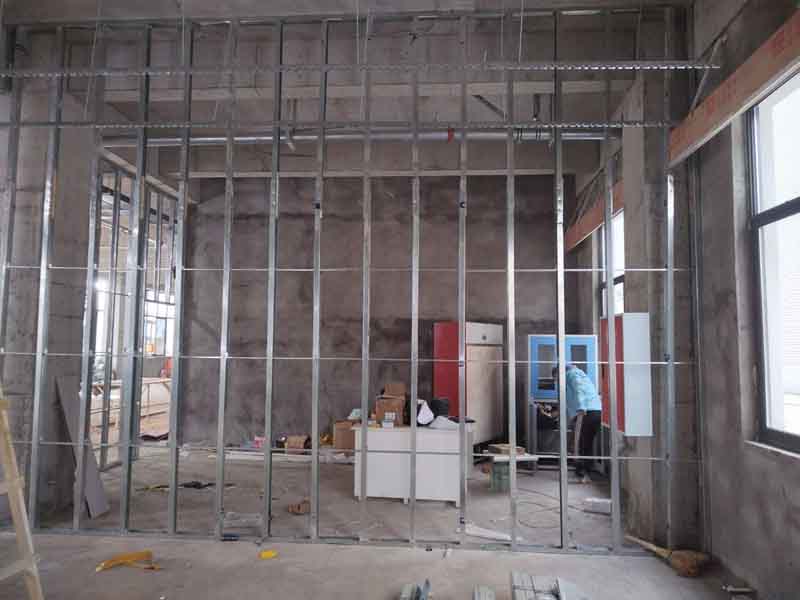 今日施工內(nèi)容:1.隔墻龍骨吊頂龍骨架設(shè) 2.隔墻封板 3.電工照明線(xiàn)路鋪設(shè)